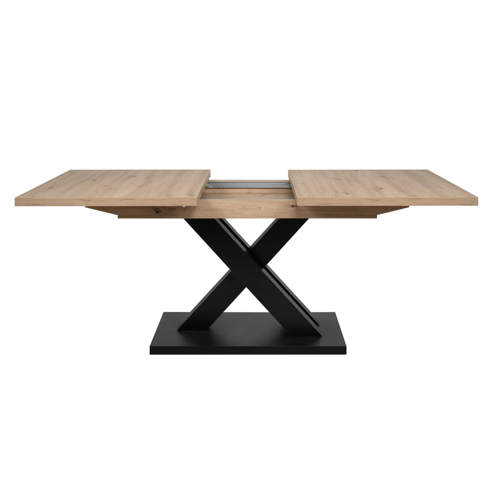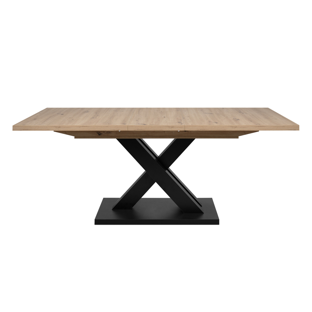 The AVANT Extendable Dining Table immediately draws attention by its cross legs ending on a base plate and give a rustic impression with its oak tone.