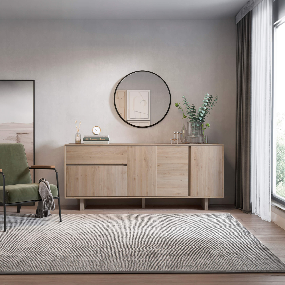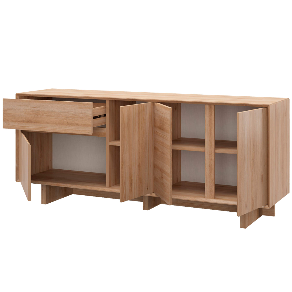 O aparador CAPRI com 4 portas e 1 gaveta combina um design minimalista em madeira clara com uma construção robusta em painel de partículas revestido a melamina. As portas amplas e a gaveta superior oferecem organização prática para quem necessita de manter a sala sempre arrumada, seja para guardar loiças, têxteis ou documentos do dia a dia.