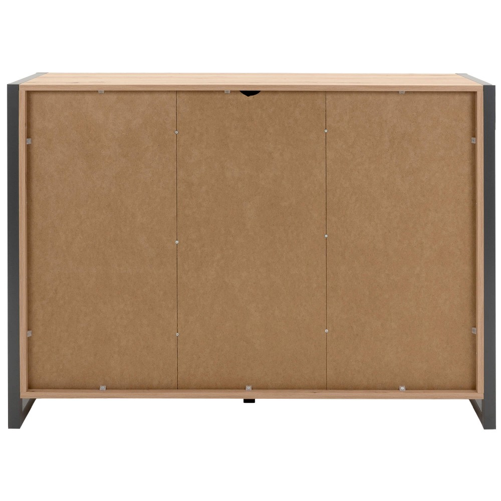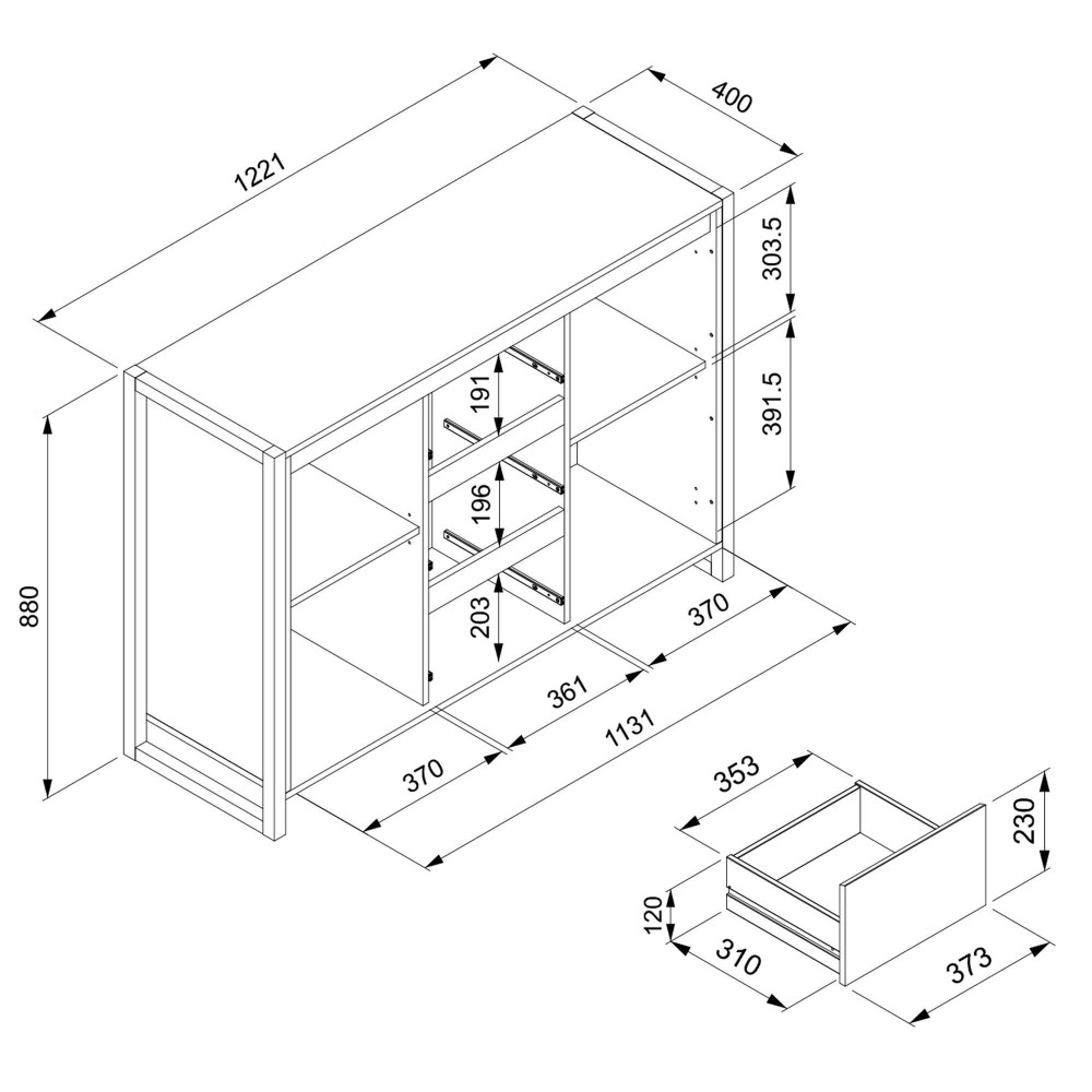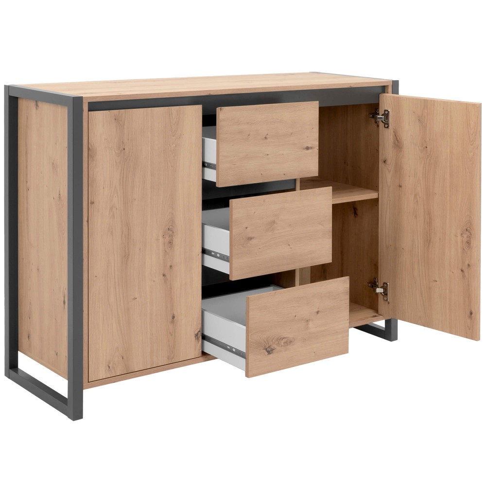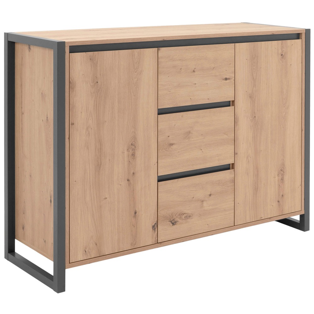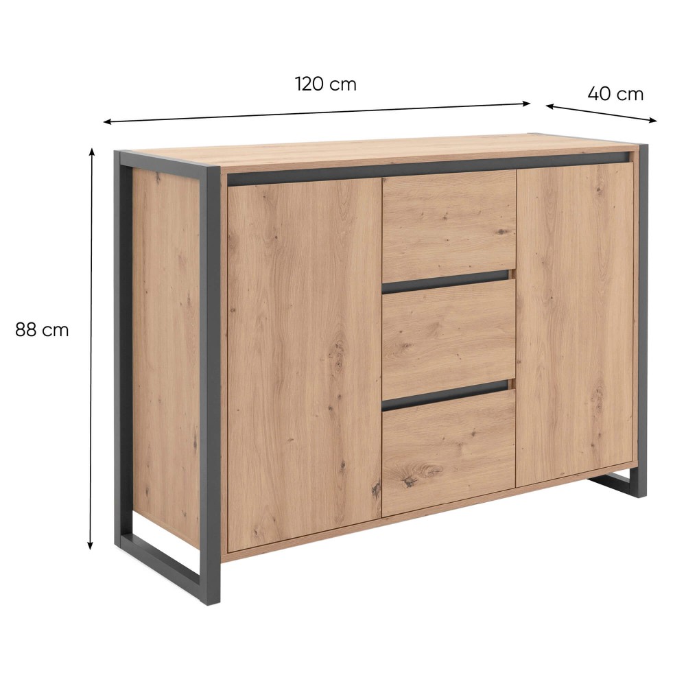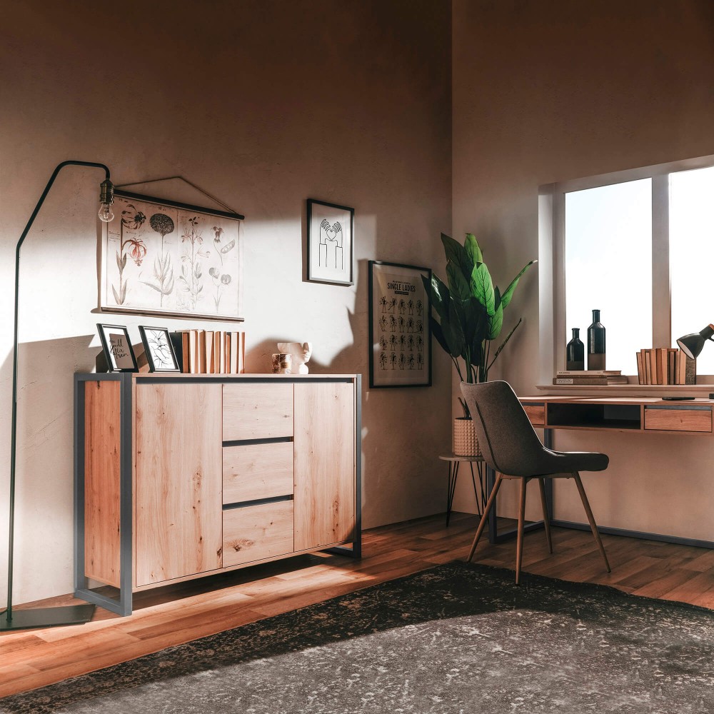 O aparador DENVER com 2 portas e 3 gavetas destaca-se pelo seu design industrial moderno, combinando a textura natural da madeira com a estrutura metálica preta. É uma peça robusta e funcional, ideal para quem procura uma solução de arrumação com presença e personalidade.