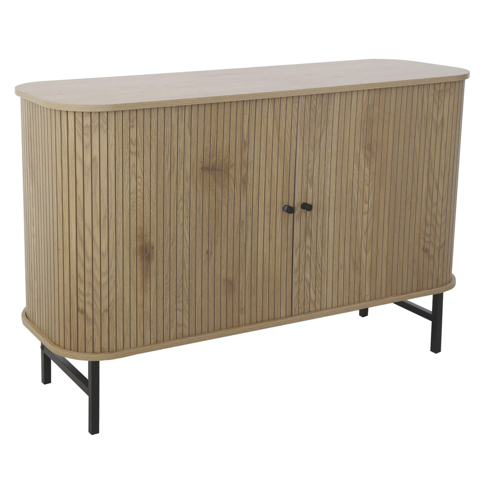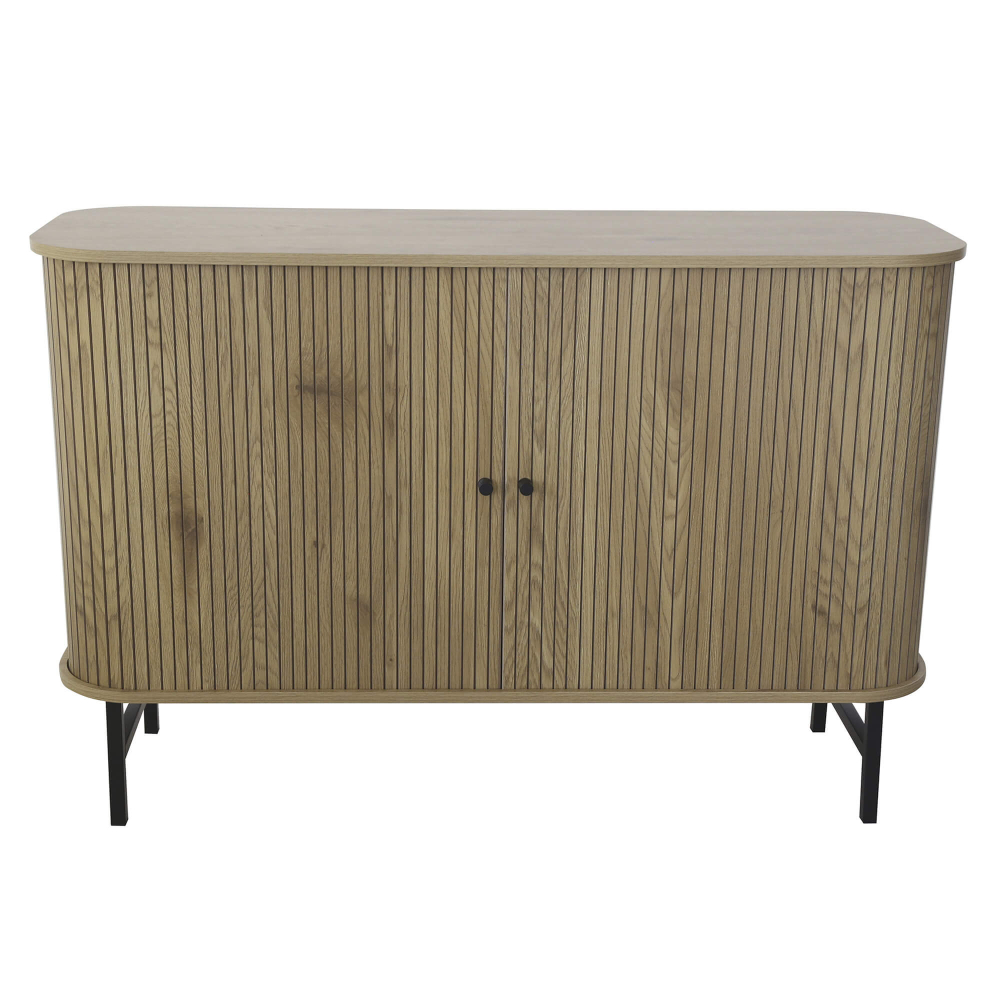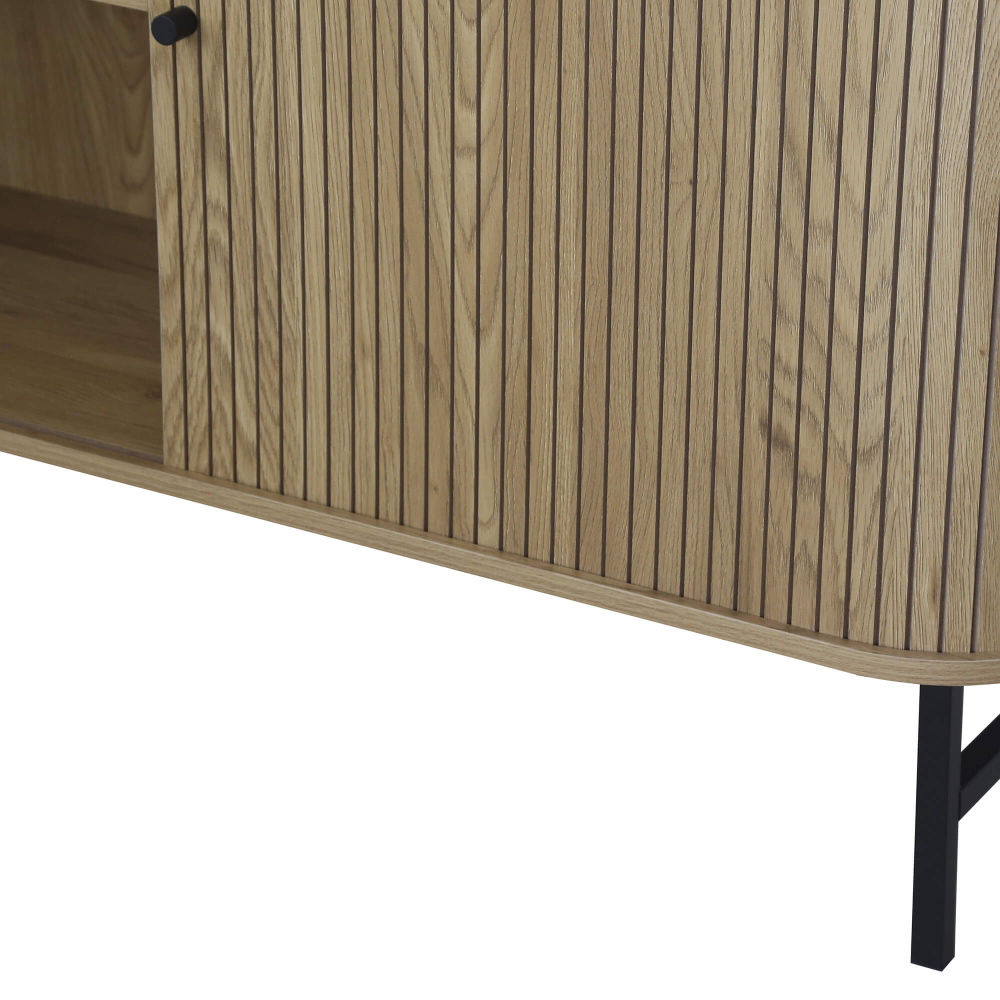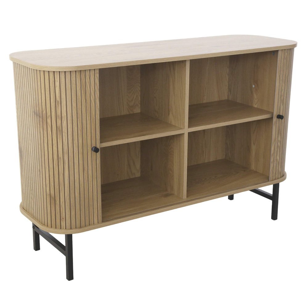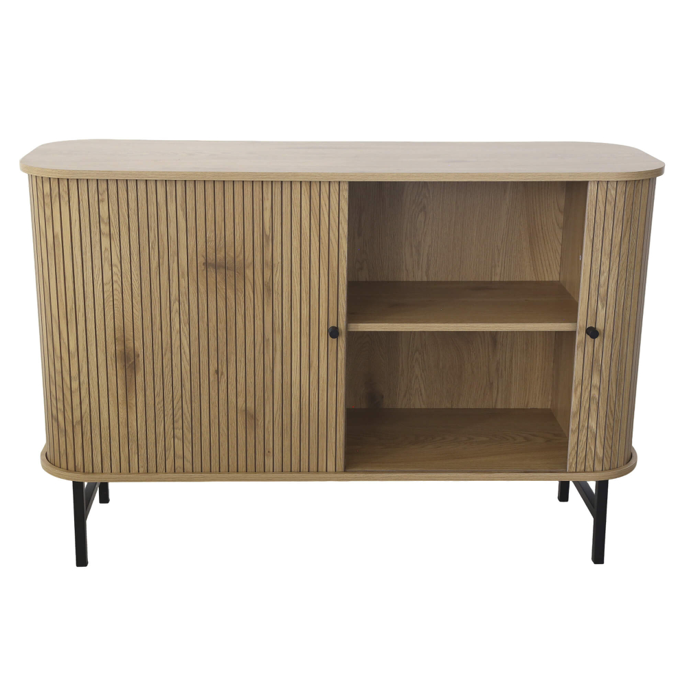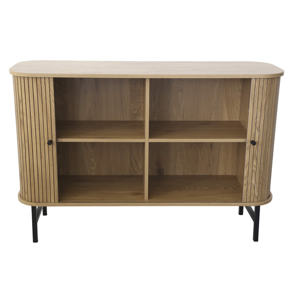 Aparador GLISS: 2 portas deslizantes ripadas, 4 compartimentos e estrutura robusta em MDF e metal.