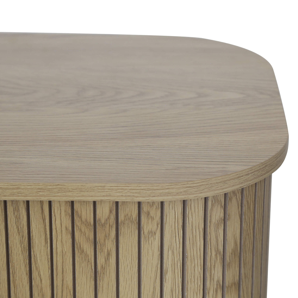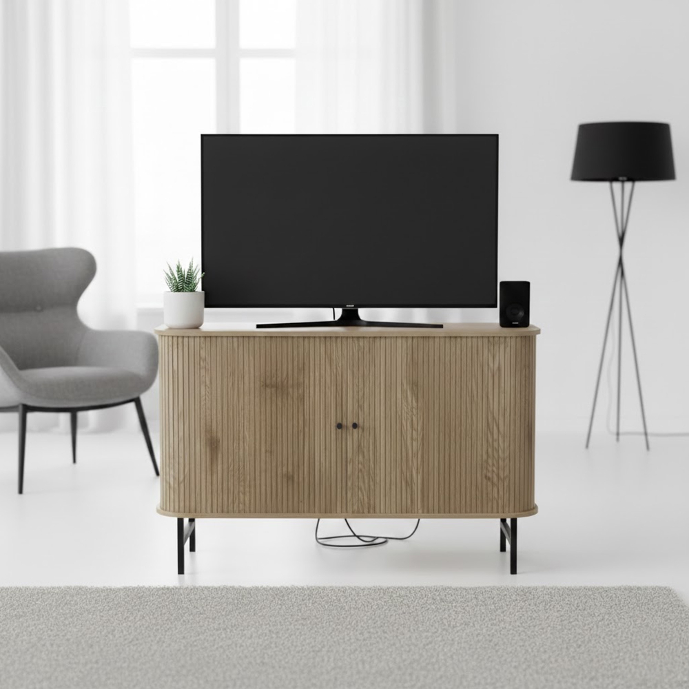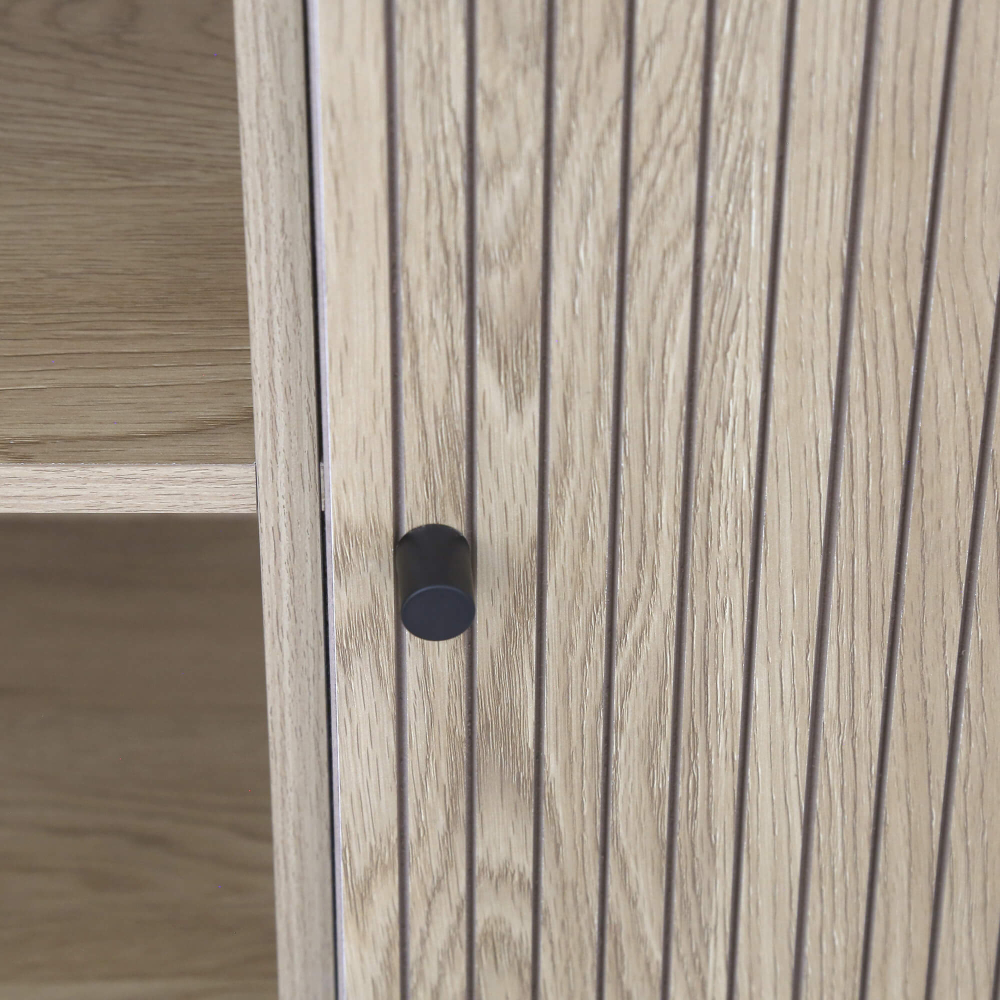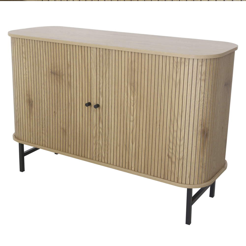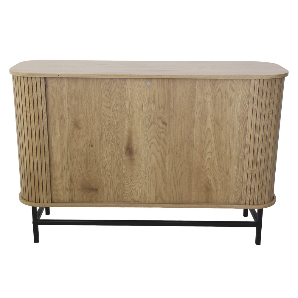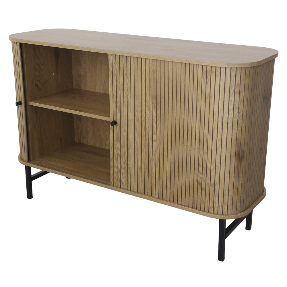 Aparador GLISS: 2 portas deslizantes ripadas, 4 compartimentos e estrutura robusta em MDF e metal.