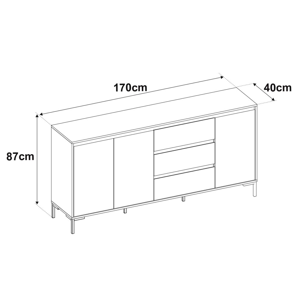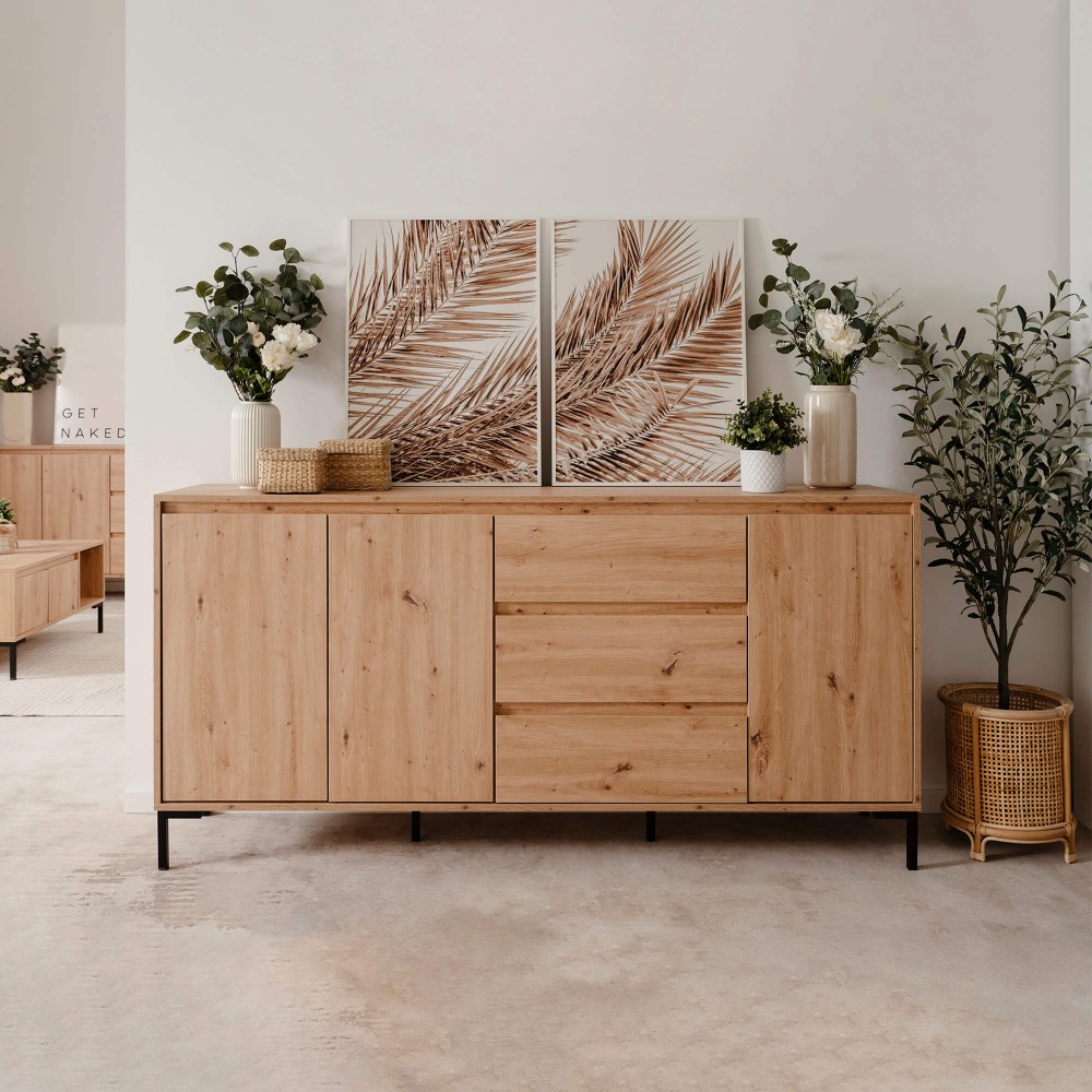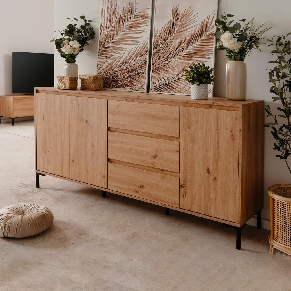 Descubra a elegância e a funcionalidade do aparador KORSIKA com 3 portas e 3 gavetas, um mobiliário versátil e moderno, ideal para qualquer divisão da sua casa. Com uma construção robusta em painel de partículas e revestimento em folha de melamina, este aparador combina durabilidade com um design natural e minimalista. O acabamento impecável com arestas em ABS/Papel confere um toque sofisticado, enquanto os pés de metal pretos proporcionam estabilidade e estilo industrial.