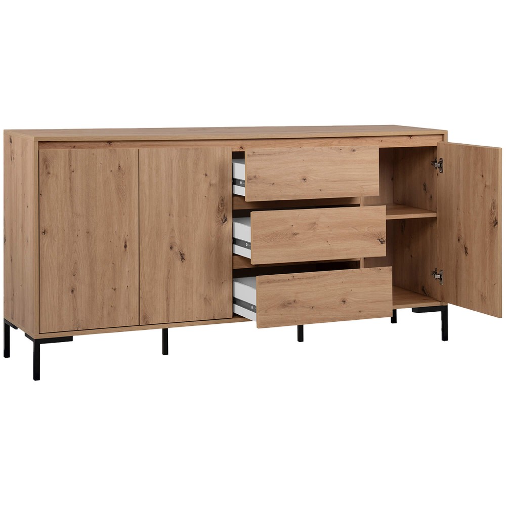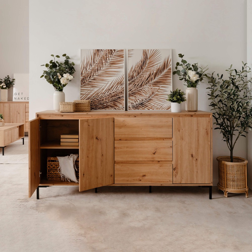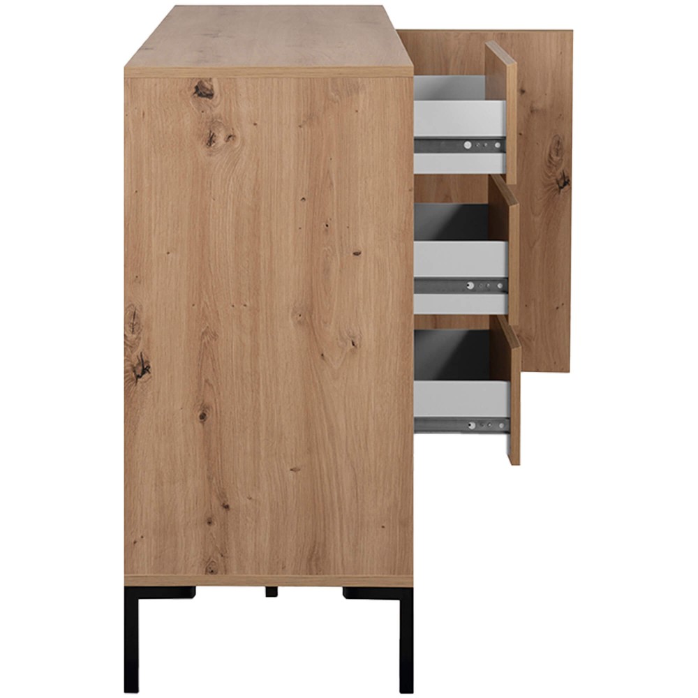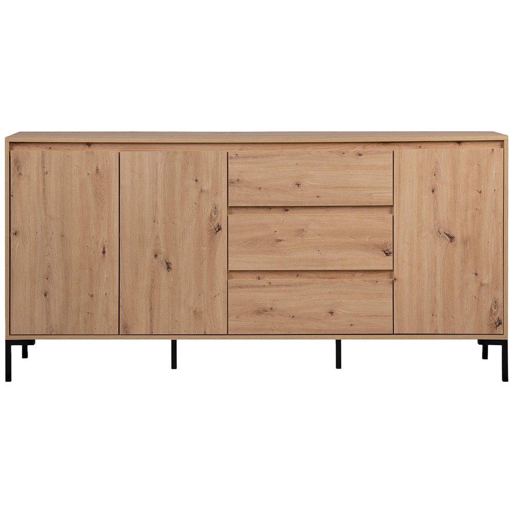 Descubra a elegância e a funcionalidade do aparador KORSIKA com 3 portas e 3 gavetas, um mobiliário versátil e moderno, ideal para qualquer divisão da sua casa. Com uma construção robusta em painel de partículas e revestimento em folha de melamina, este aparador combina durabilidade com um design natural e minimalista. O acabamento impecável com arestas em ABS/Papel confere um toque sofisticado, enquanto os pés de metal pretos proporcionam estabilidade e estilo industrial.