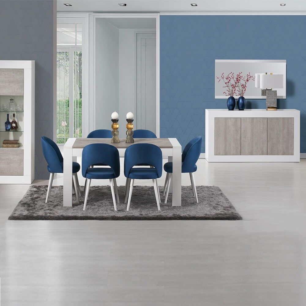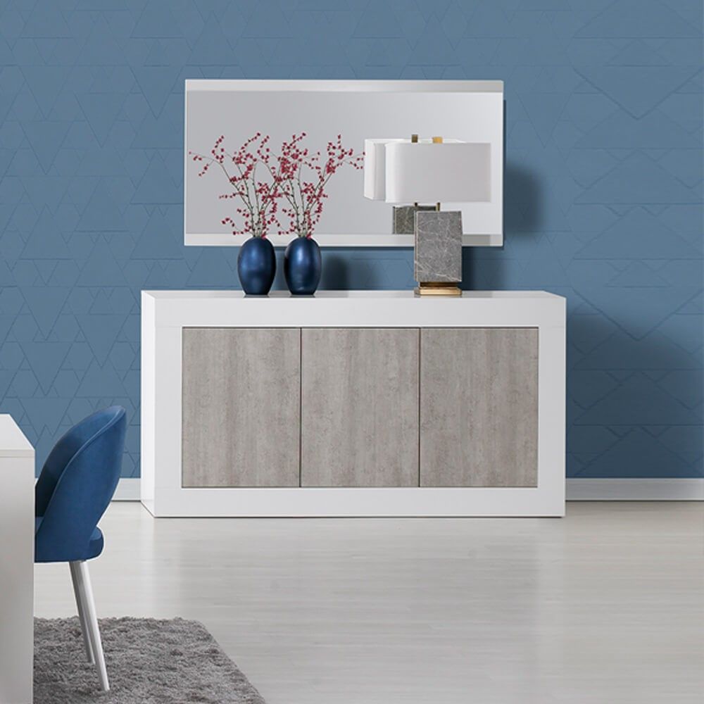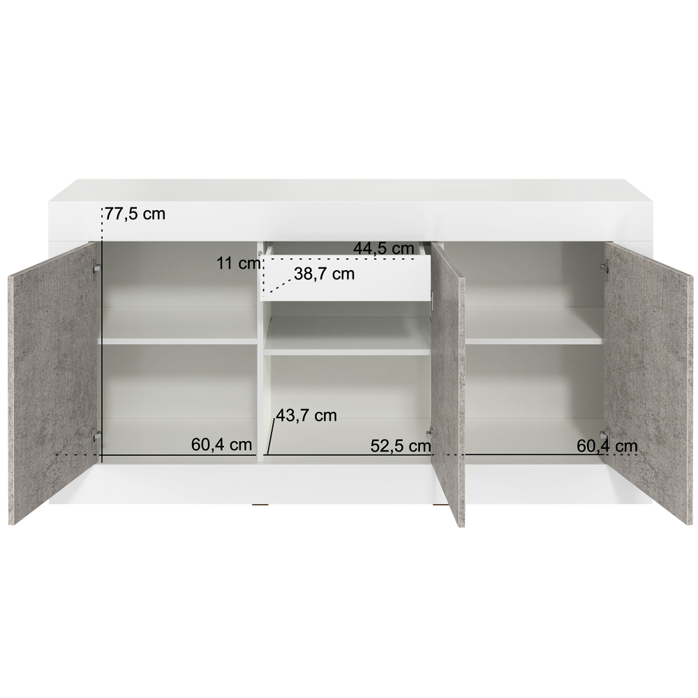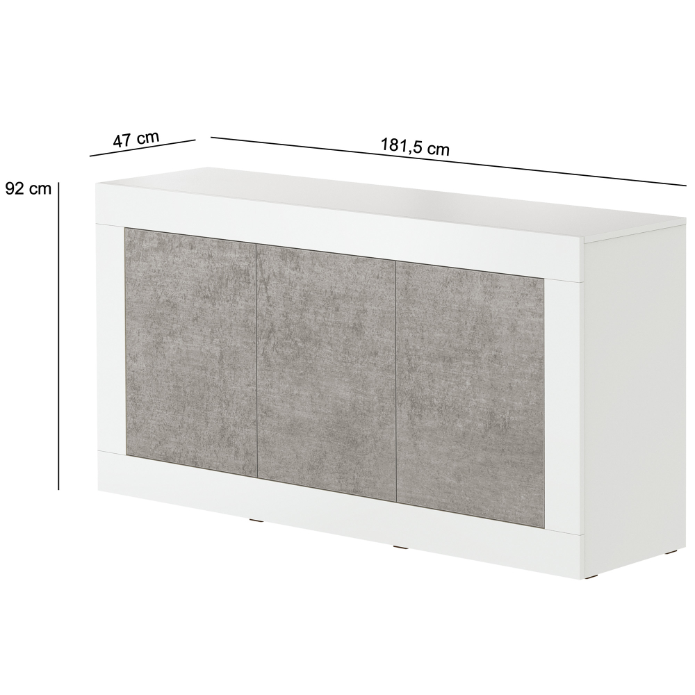 O aparador MADRID com 3 portas combina linhas geométricas com um toque contemporâneo, ideal para quem valoriza design e funcionalidade no mesmo móvel. A estrutura em branco contrasta com as portas em acabamento betão claro, criando um visual moderno e sofisticado para qualquer sala.