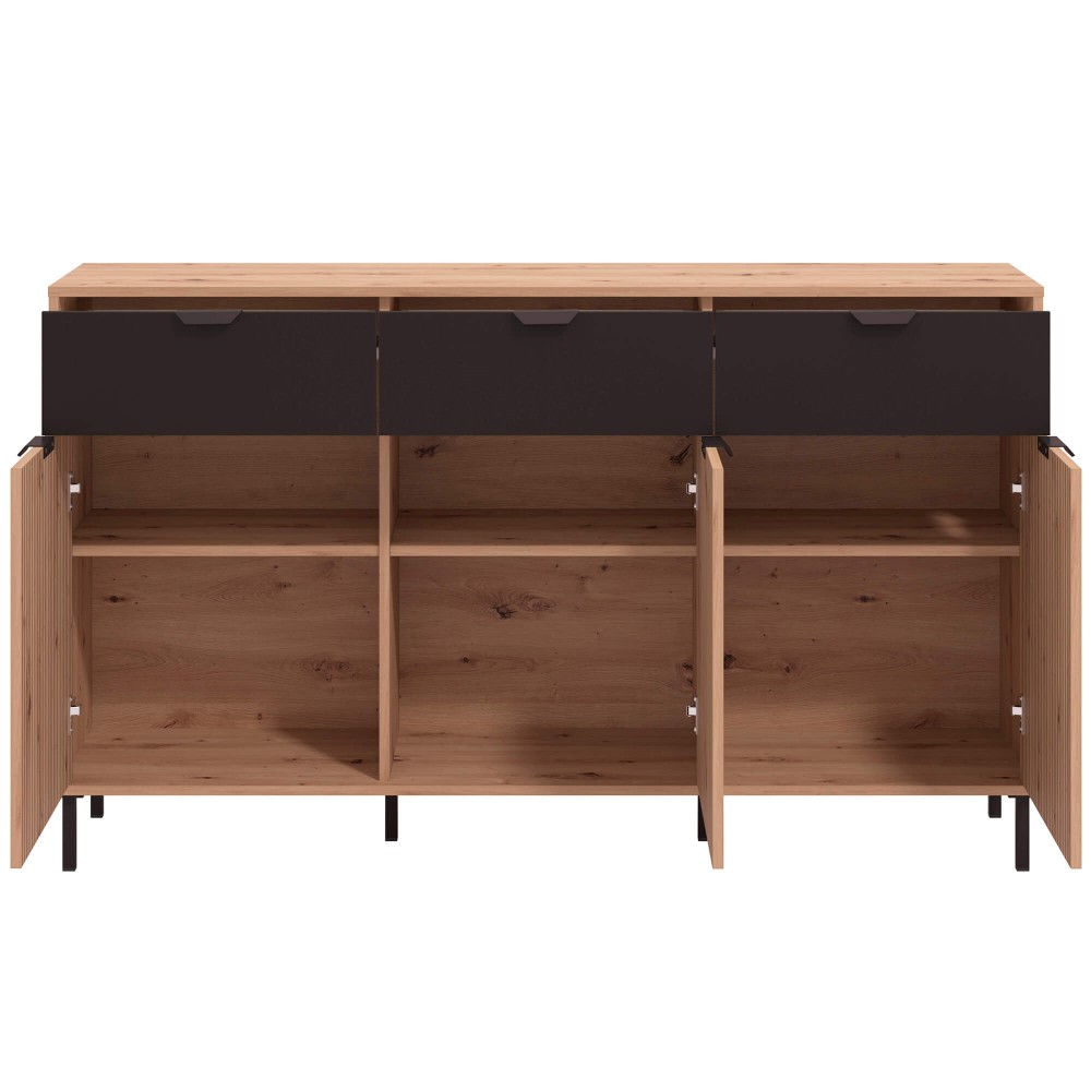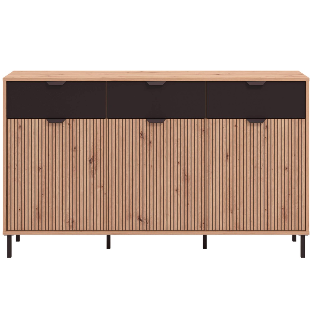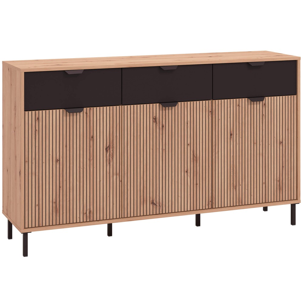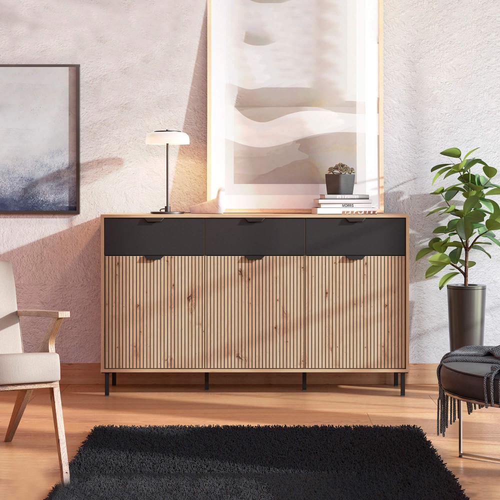 O Aparador MAYENNE com 3 portas e 3 gavetas combina uma estrutura em painel de partículas com acabamento efeito madeira natural e frentes superiores em preto mate. As portas apresentam um design ripado vertical que reforça a personalidade do móvel, enquanto as gavetas com puxadores integrados oferecem acesso cómodo. O interior é dividido em módulos amplos com prateleiras estáveis, perfeitas para organizar loiças, têxteis ou objetos de uso frequente.