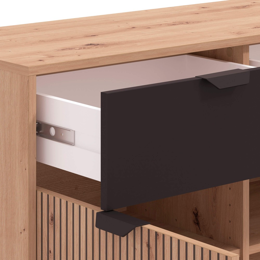A combinação entre o ripado decorativo, o tom quente da madeira e o contraste do preto cria um visual contemporâneo, sofisticado e marcante, ideal para salas de estar e jantar modernas. A distribuição equilibrada entre portas e gavetas permite arrumar discretamente tudo o que normalmente fica à vista, ajudando a manter o ambiente limpo, elegante e com maior sensação de ordem.