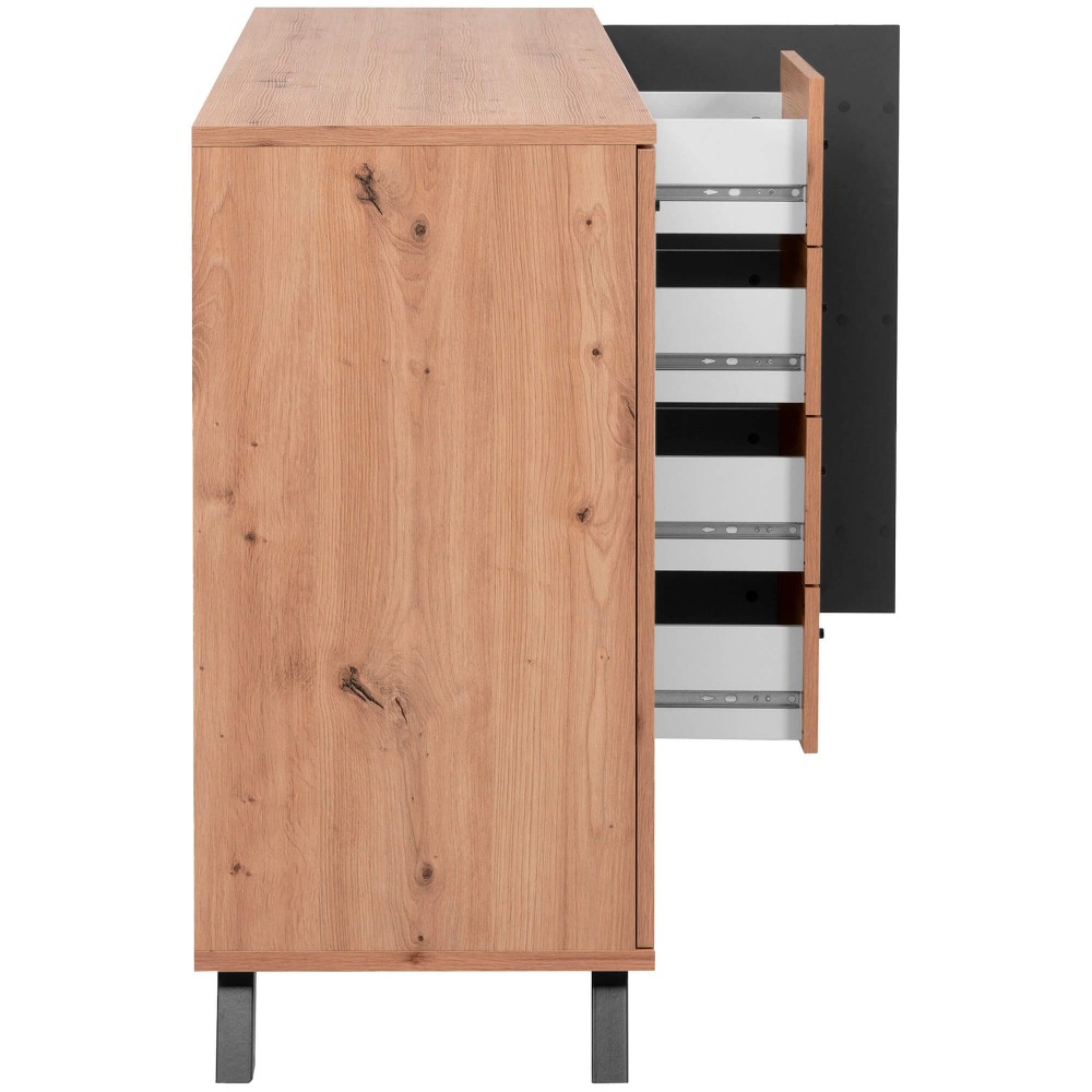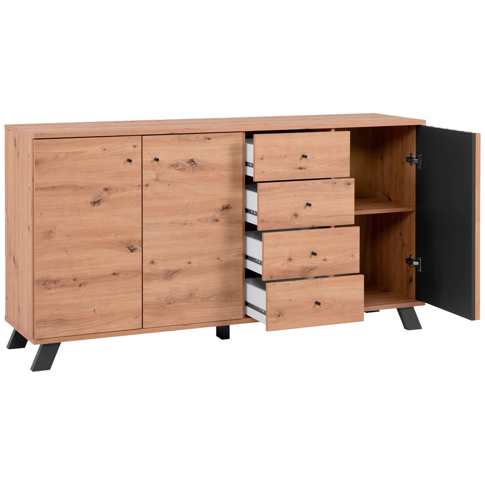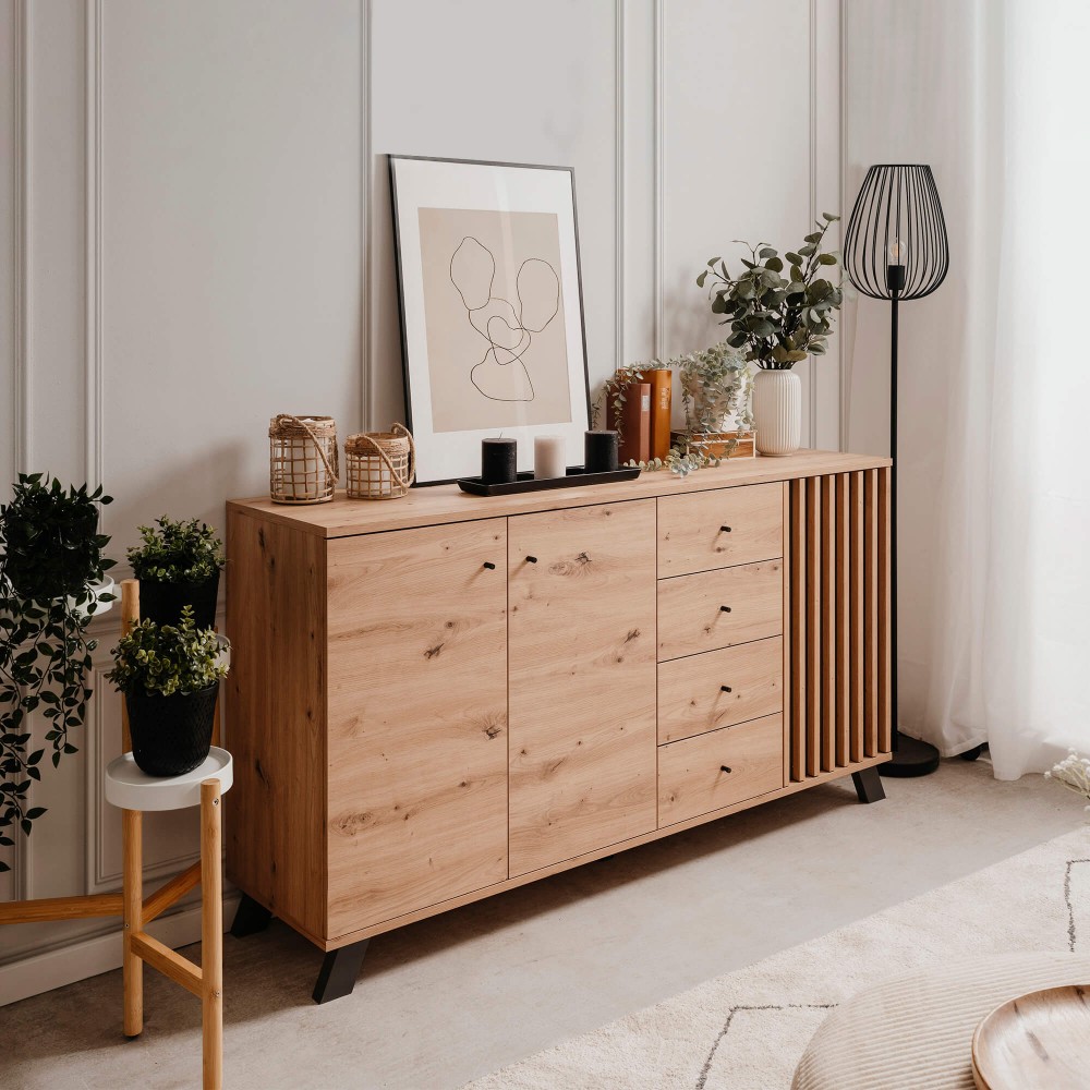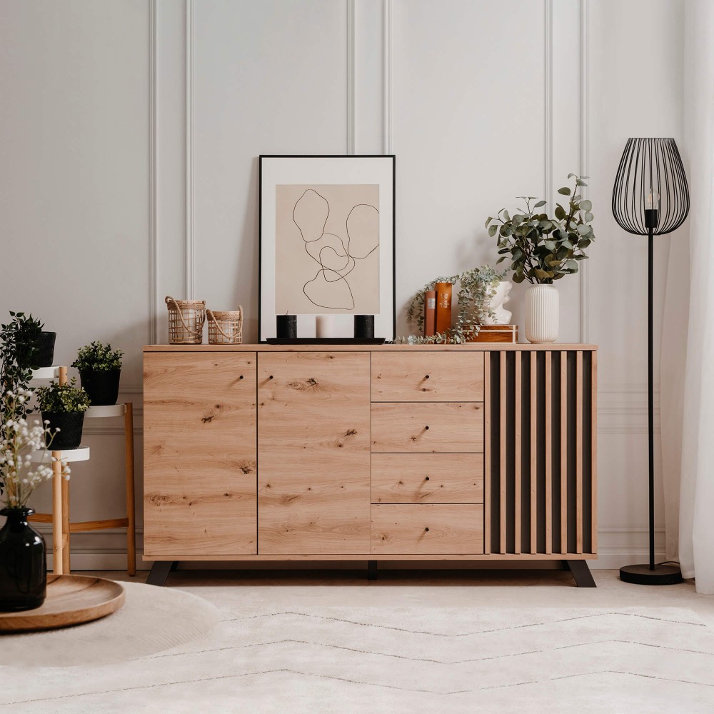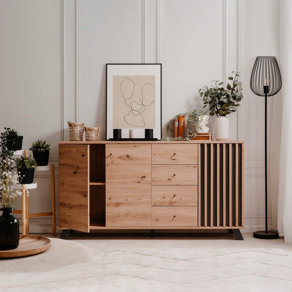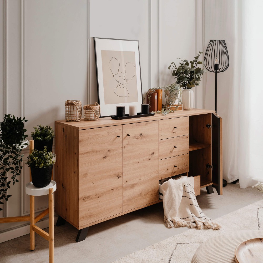 Com ampla capacidade de arrumação, o Aparador MEDAN com 3 portas e 4 gavetas adapta-se facilmente a diferentes estilos de interiores, tornando-se ideal para organizar louças, têxteis ou documentos de forma elegante e acessível.