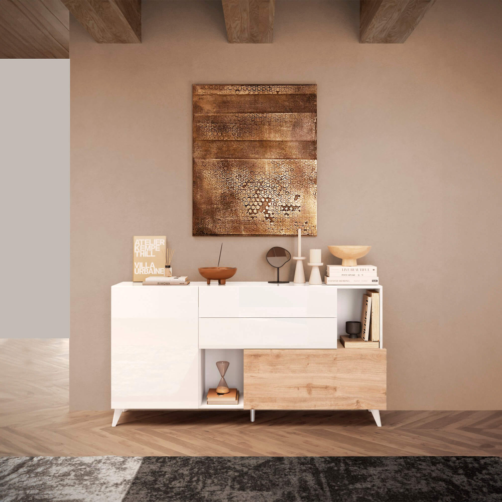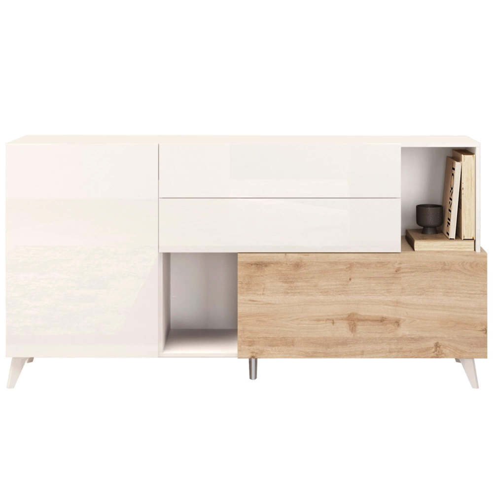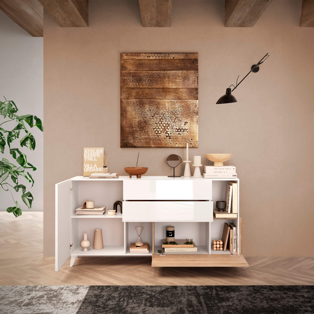 Aparador MONACO com design moderno que combina branco brilho e carvalho claro com arrumação versátil