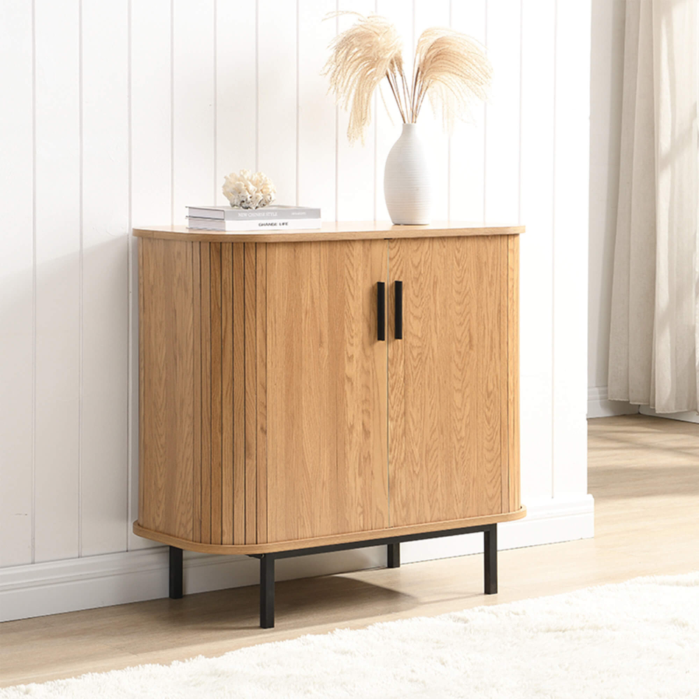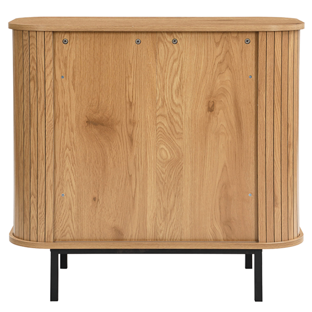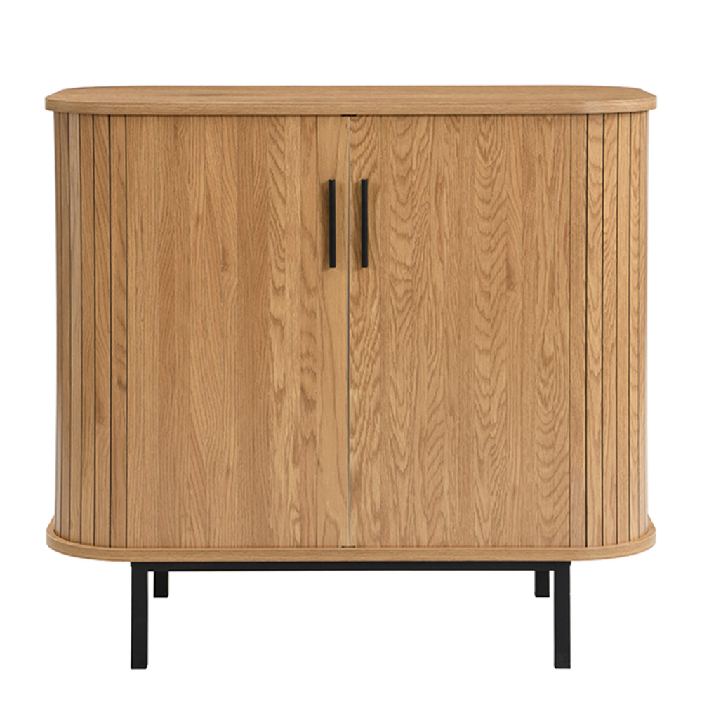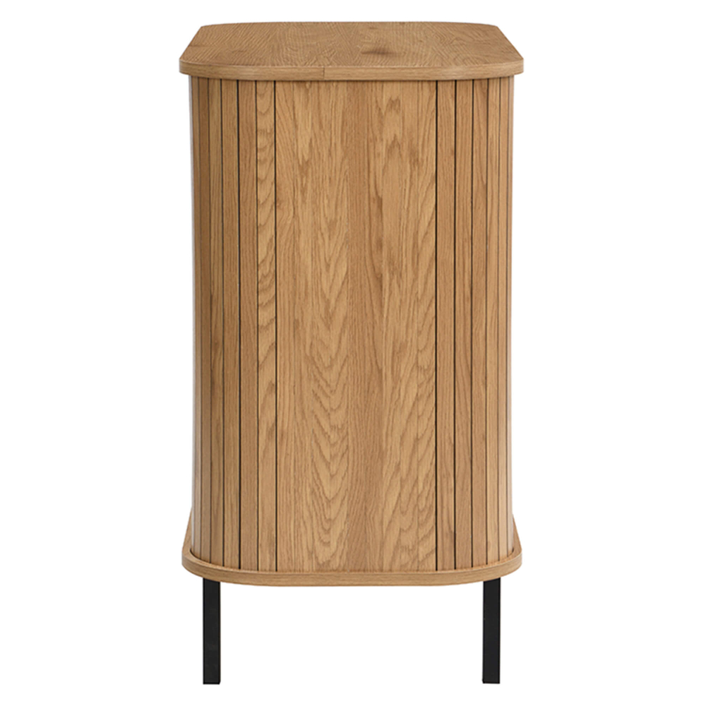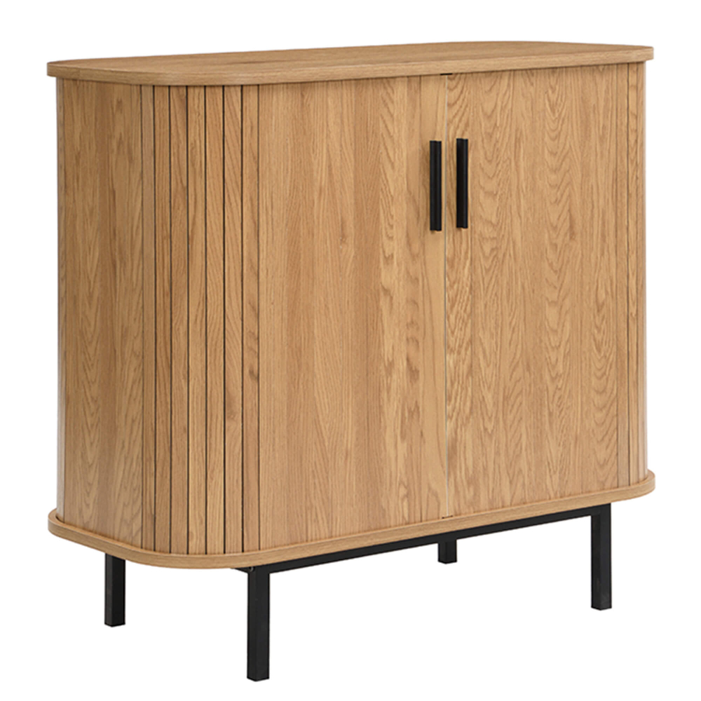 Com um design arredondado e acabamento natural, o aparador PASTEUR destaca-se pelo ripado vertical nas laterais e estrutura robusta. As duas portas frontais deslizam para revelar um amplo espaço de arrumação interior, ideal para manter a organização com estilo. Os puxadores metálicos pretos dão-lhe um toque moderno e contrastante.