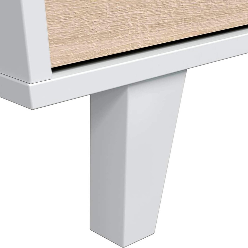 Com uma estrutura elevada e pés inclinados, este aparador proporciona leveza visual e facilita a limpeza do espaço. O sistema de abertura por pressão elimina a necessidade de puxadores, reforçando o estilo minimalista do conjunto.