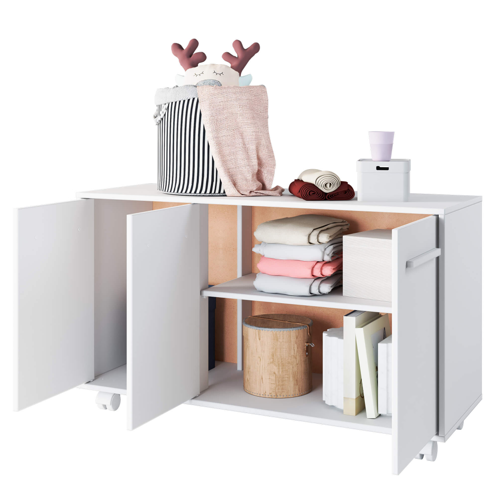 O seu acabamento branco mate no exterior combina com qualquer decoração, enquanto o interior em painel natural dá um toque de contraste subtil. Equipado com rodízios, pode ser facilmente deslocado, tornando-se num aliado versátil e funcional no dia a dia.