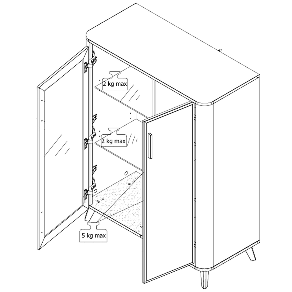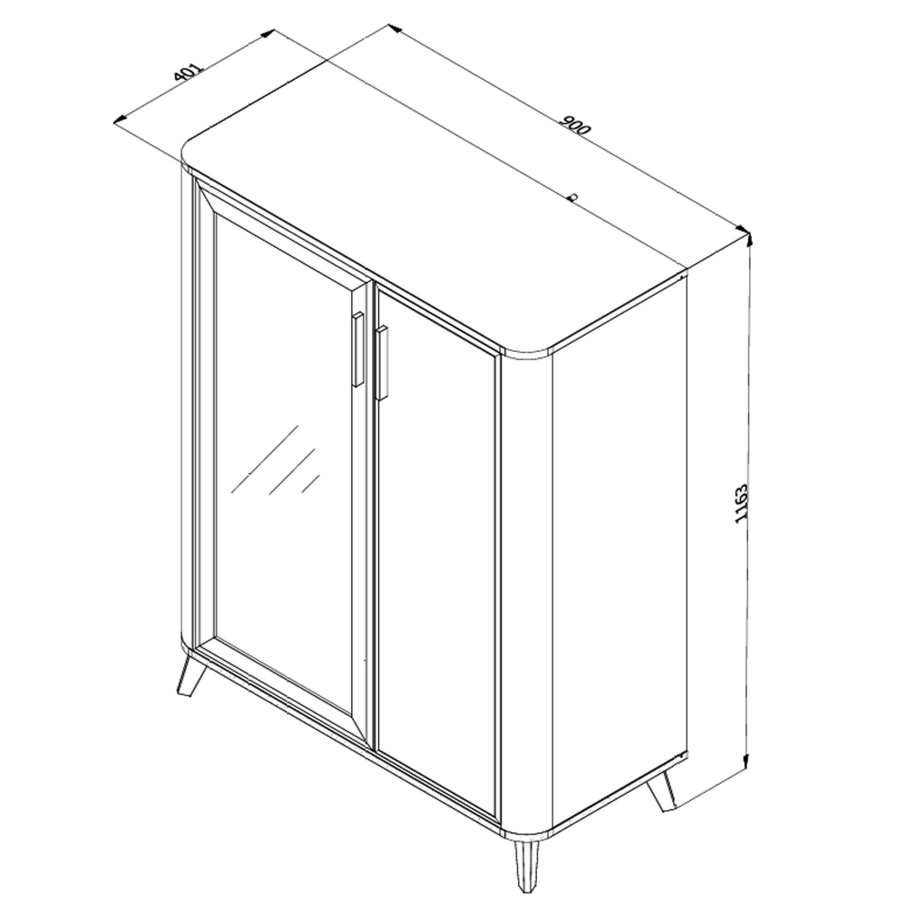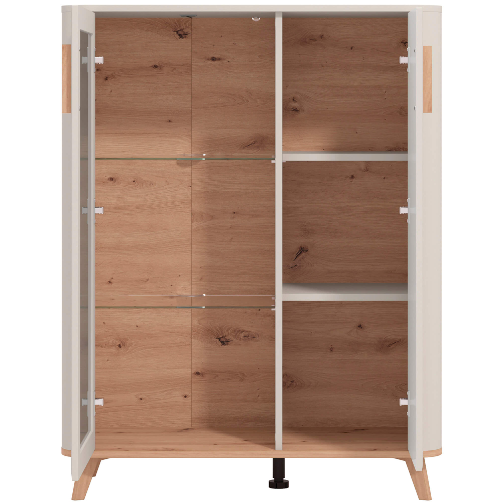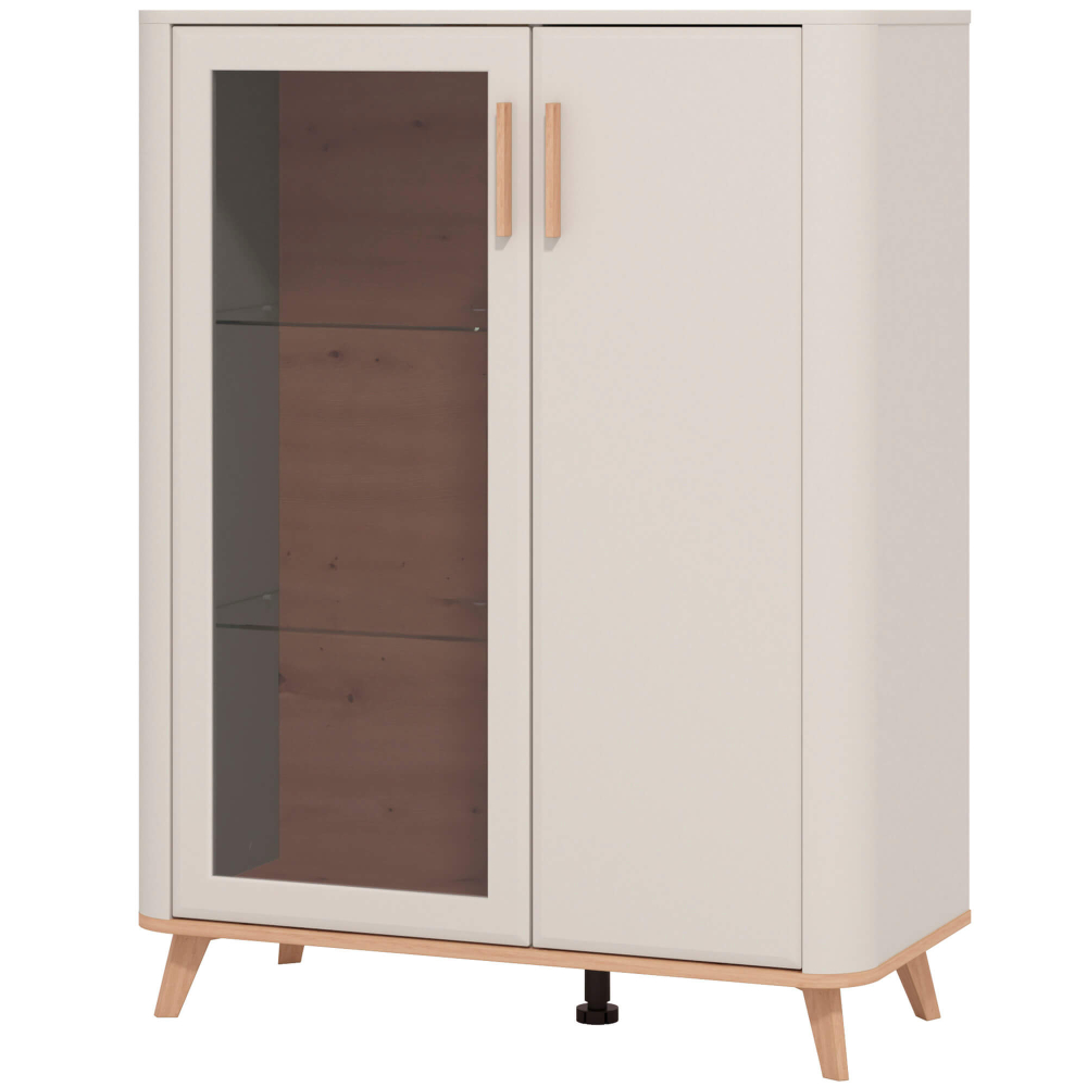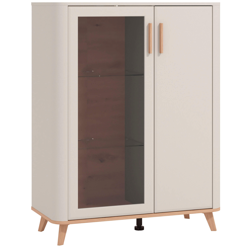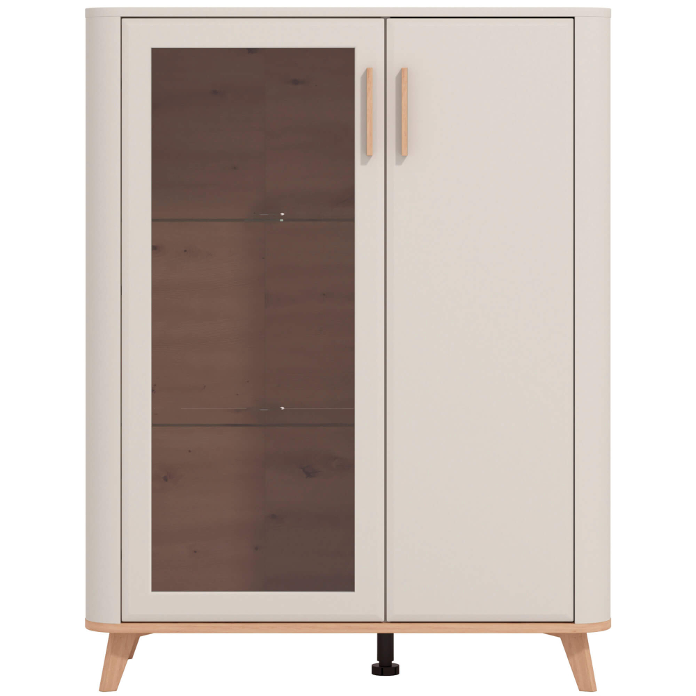 A estrutura vertical, de linhas suaves e arredondadas, conjuga-se com o interior amadeirado e prateleiras de vidro, criando um espaço acolhedor para exibir ou guardar os seus itens favoritos. As pegas contrastantes e os pés em madeira completam o estilo leve e sofisticado.