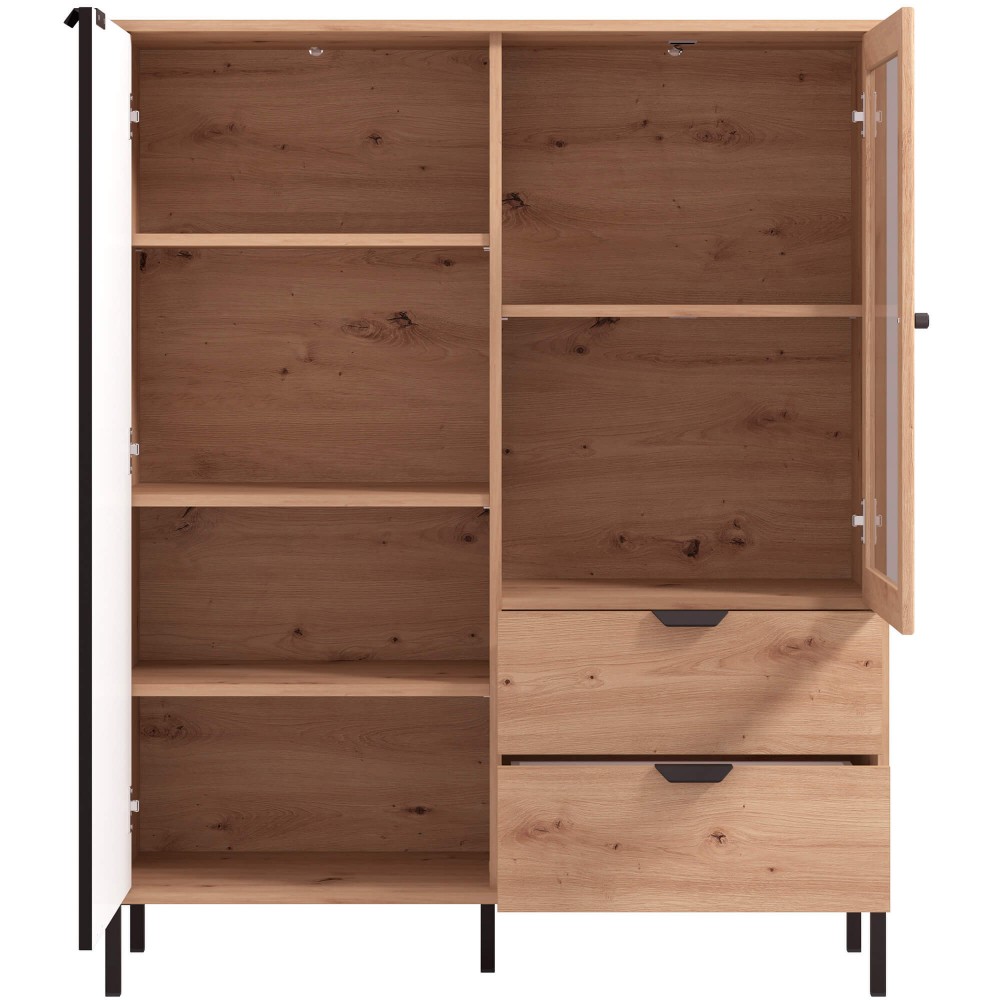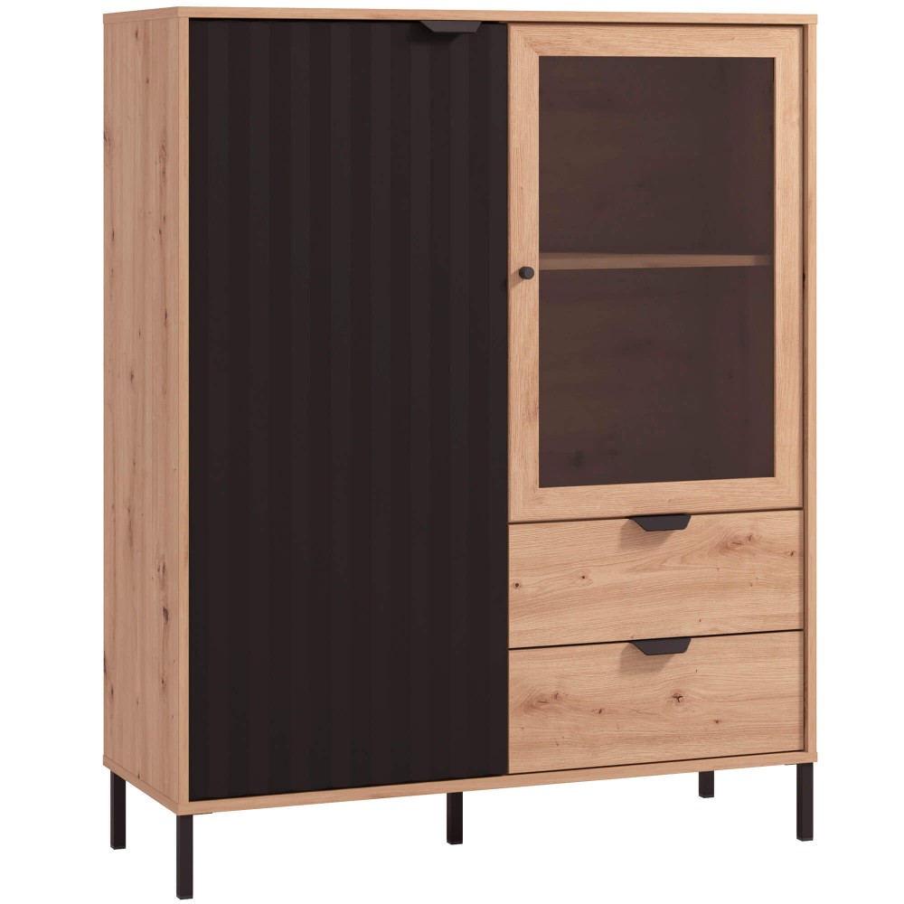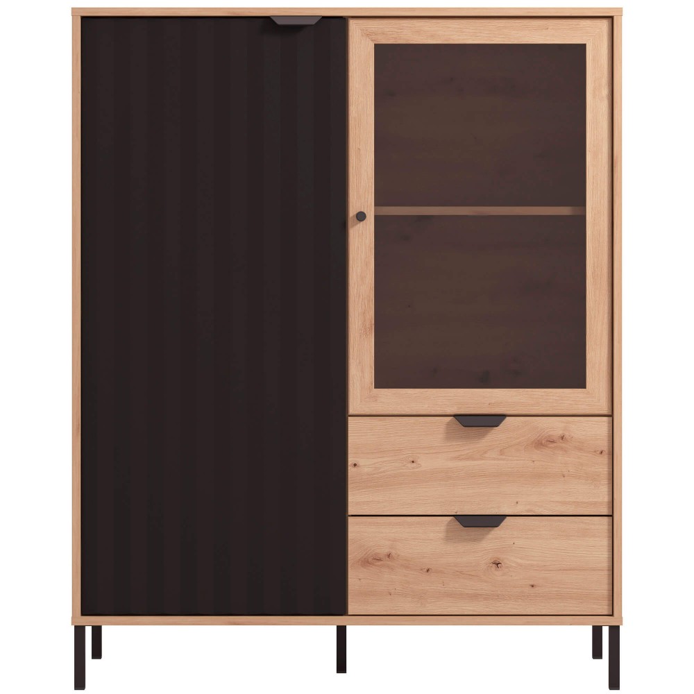 O elemento bar VANDEA destaca-se pela sua estrutura sólida em painel de partículas e MDF, com acabamento mate em melamina, que garante durabilidade e um toque requintado. Possui duas portas — uma em vidro temperado escurecido e outra com efeito ondulado 3D —, que adicionam profundidade e originalidade ao design. As duas gavetas e quatro prateleiras oferecem ampla capacidade de arrumação, enquanto os pés e puxadores em metal reforçam o estilo industrial contemporâneo deste elemento bar.