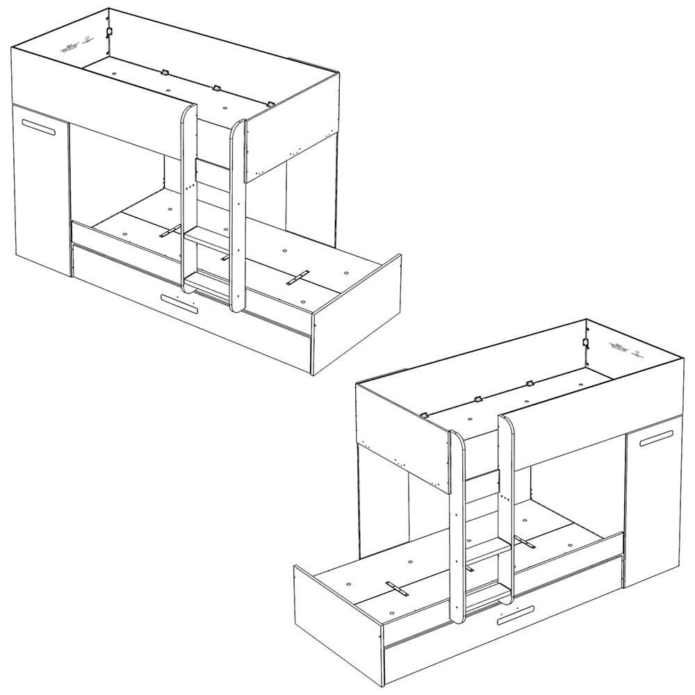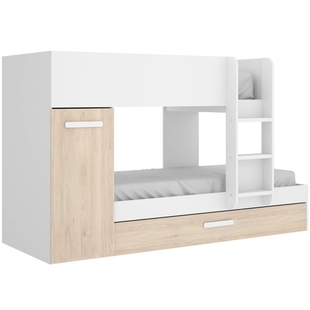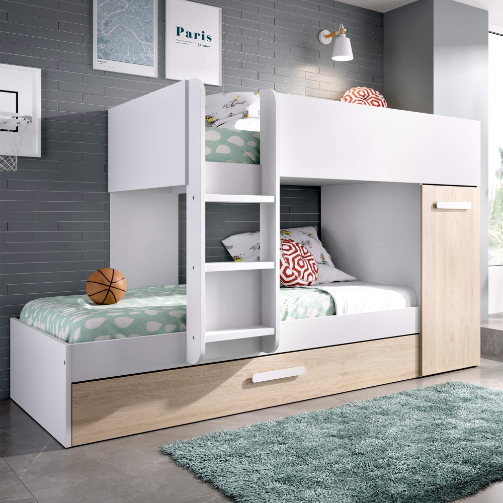 O Beliche JERRY com gavetão e armário combina duas camas, arrumação integrada e uma estrutura segura, ideal para quartos partilhados ou espaços compactos. A cama inferior inclui um amplo gavetão de extração total, enquanto o módulo lateral oferece um armário vertical perfeito para roupa, brinquedos ou material escolar.