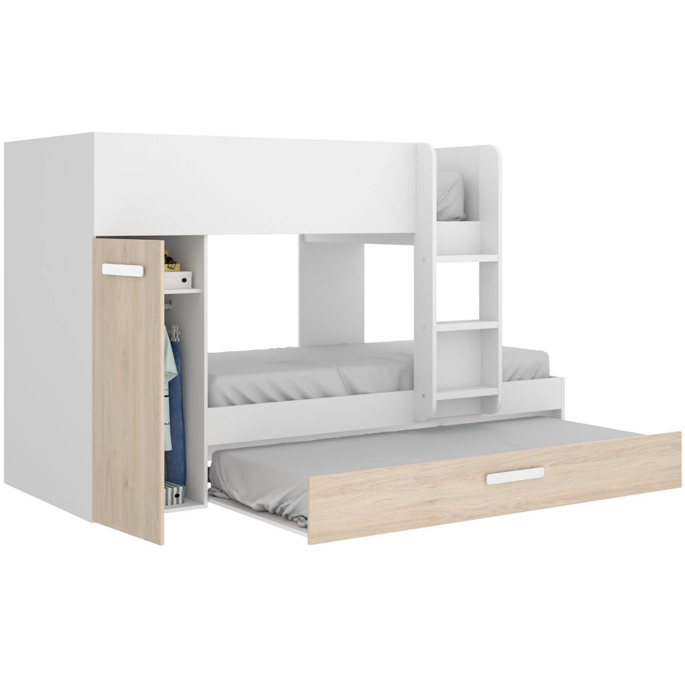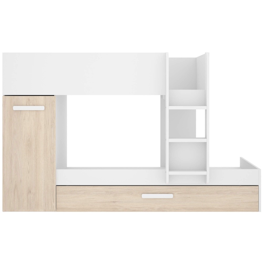 Este beliche proporciona organização extra sem ocupar mais espaço, tornando o quarto mais funcional. A escada frontal com degraus largos facilita a subida, e o design moderno em branco e carvalho claro adapta-se facilmente a qualquer decoração juvenil.