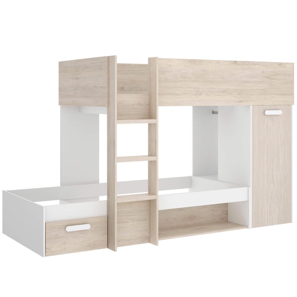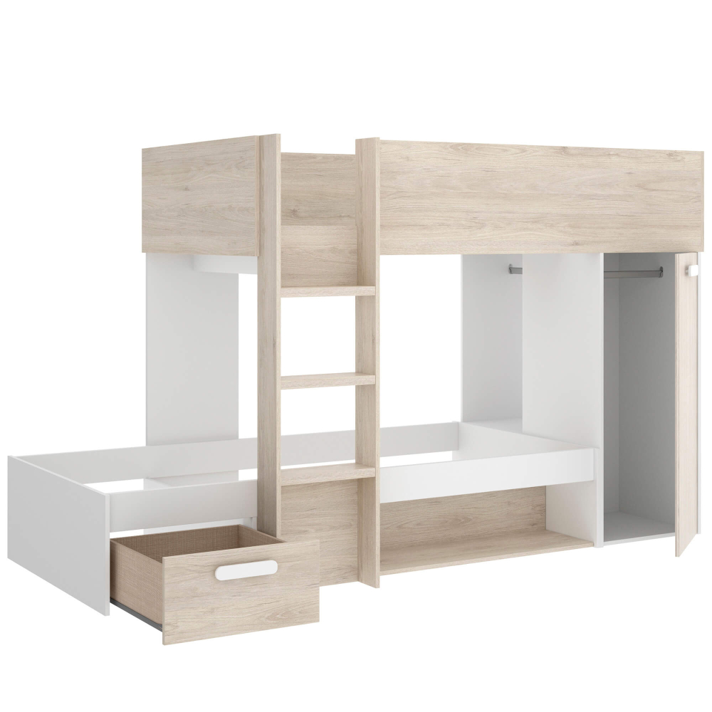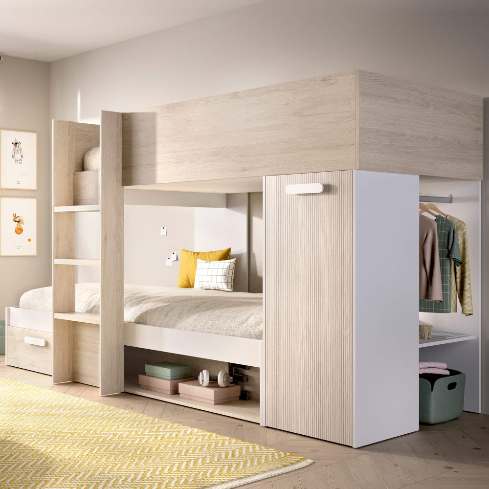 A utilização inteligente do espaço oferece conforto para duas camas individuais, espaço de arrumação inferior para caixas ou brinquedos, gaveta lateral funcional e um roupeiro aberto com barra metálica para manter a roupa sempre organizada. A estética em carvalho claro com branco cria um ambiente luminoso e moderno.