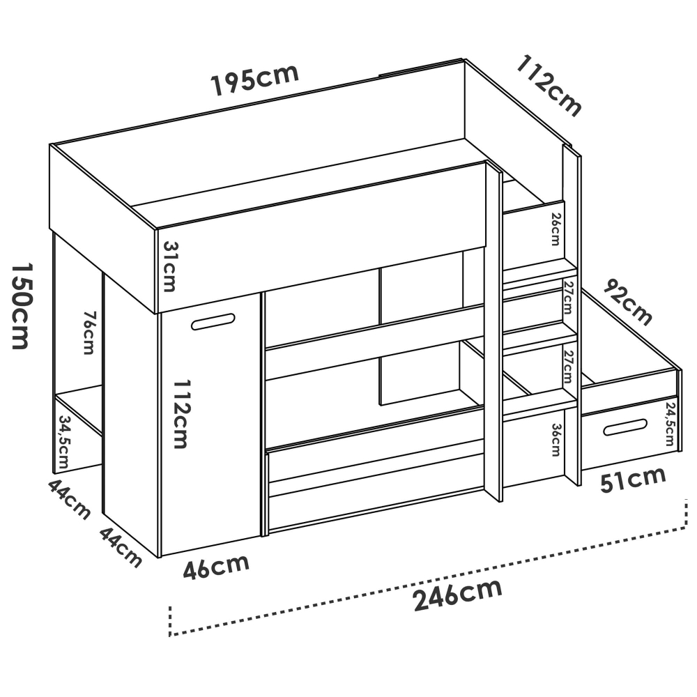 O Beliche TWEETY reversível combina cama superior e cama inferior com arrumação integrada, estrutura robusta em MDF, escada frontal e um módulo lateral com zona de roupeiro. A montagem reversível permite adaptar a configuração ao espaço disponível, garantindo flexibilidade tanto para quartos compactos como para divisões mais amplas.