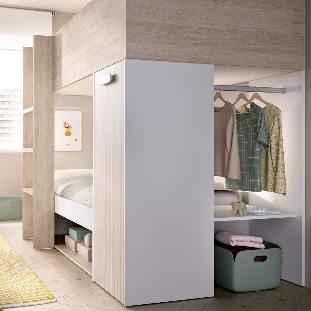 Beliche TWEETY reversível: duas camas, arrumação integrada e roupeiro num só módulo.