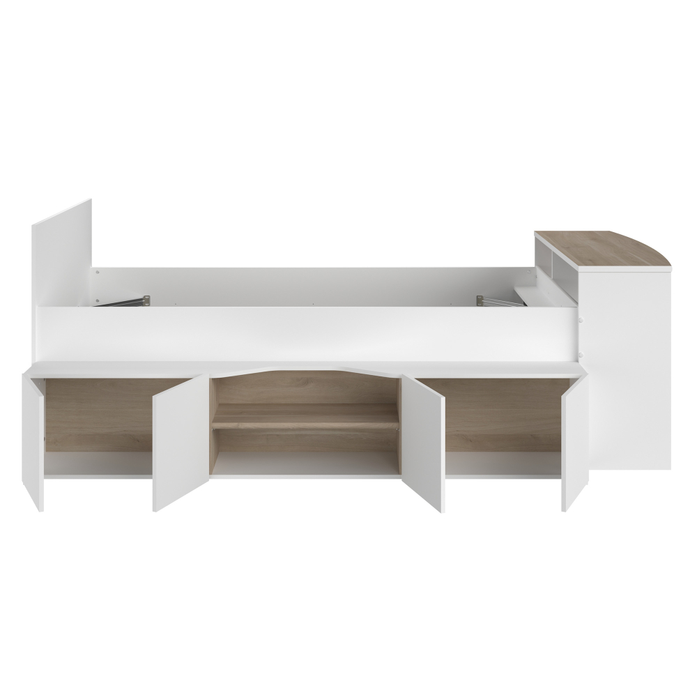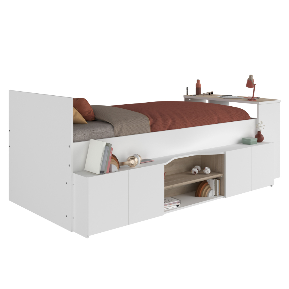 Cama alta CLEO com secretária para estudo e arrumação num formato compacto.