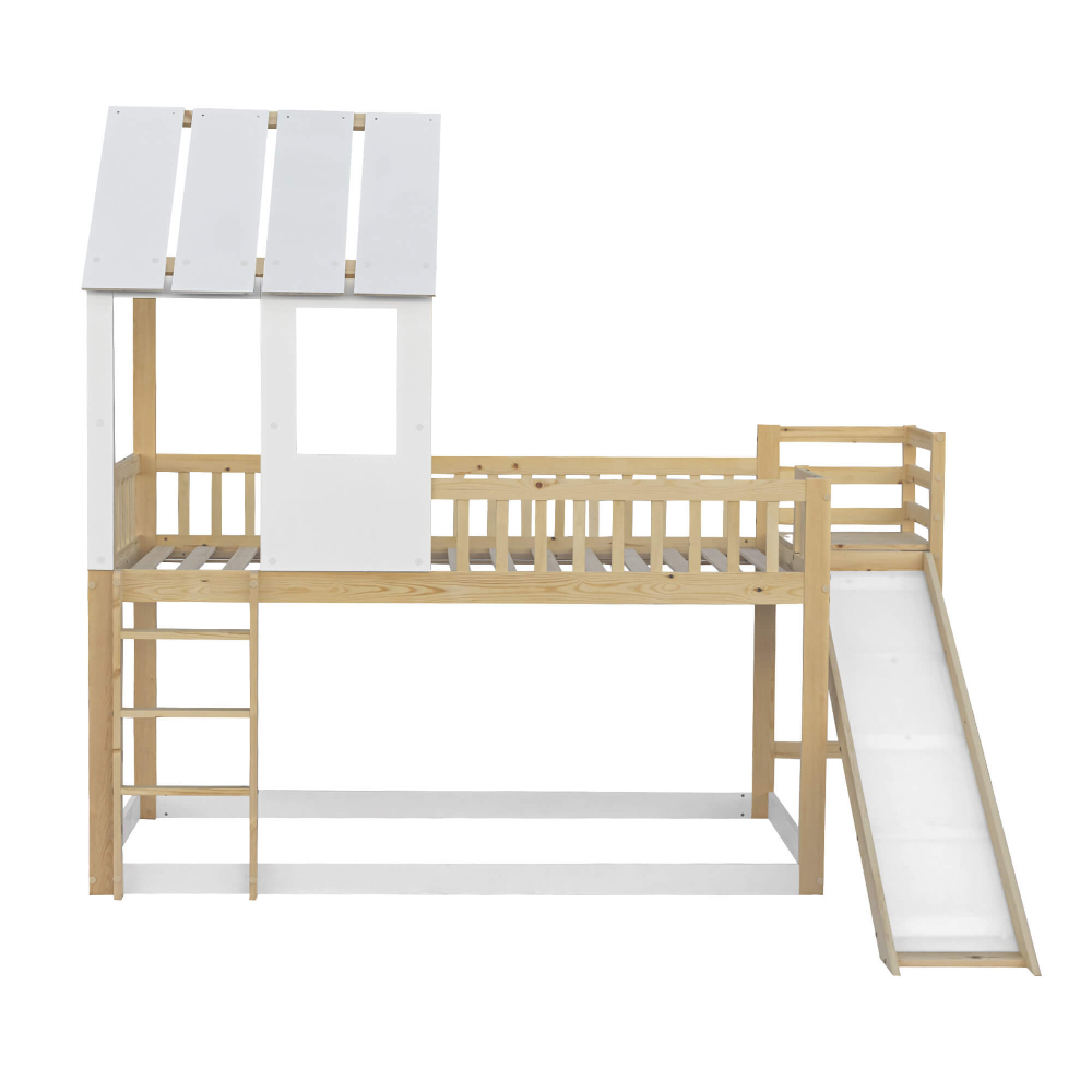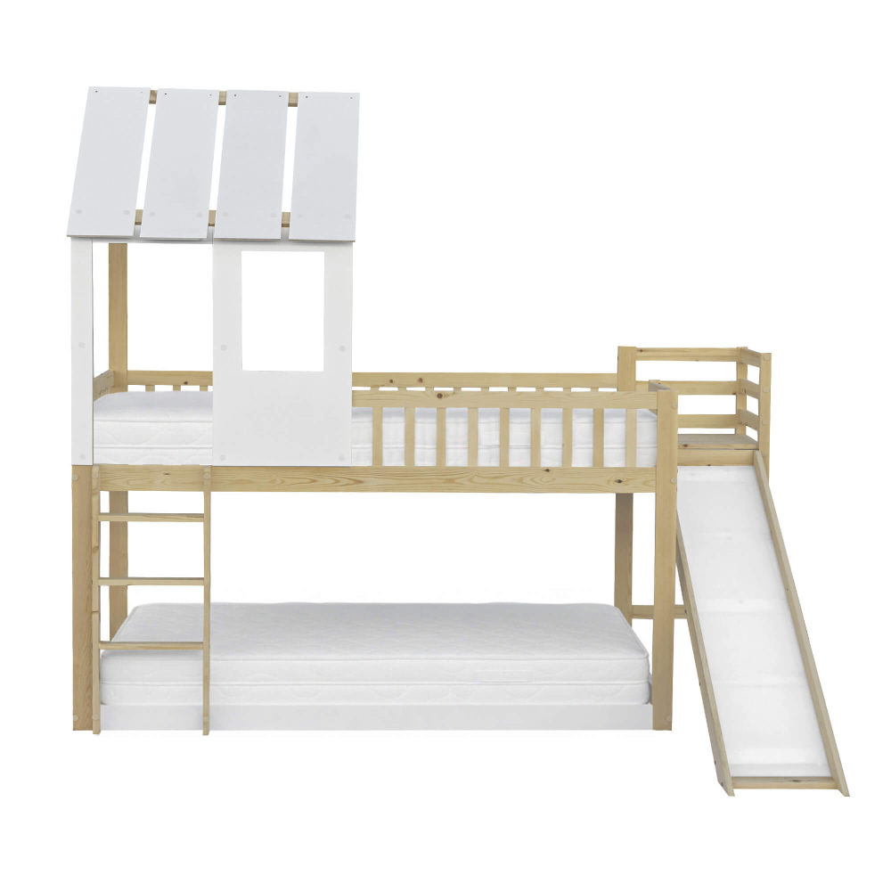 A cama alta dupla TOBO com escorrega - design divertido em formato de casa e em pinho maciço e branco. Já imaginou transformar o quarto das crianças num verdadeiro parque de diversões e casinha de brincar ao mesmo tempo? Com a encantadora cama alta dupla TOBO com escorrega, esse sonho torna-se realidade! Esta cama infantil elevada, de inspiração casinha, é muito mais do que um lugar de dormir – é um convite diário à brincadeira e à imaginação. Os pequenos aventureiros sobem pela escada de 3 degraus até ao “segundo andar” aconchegante e descem pelo escorrega com um sorriso de orelha a orelha, tornando cada despertar numa festa.