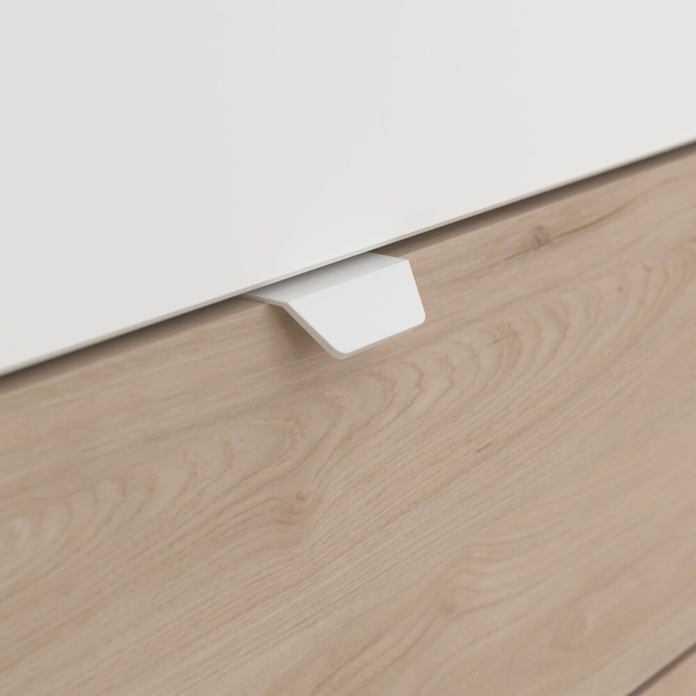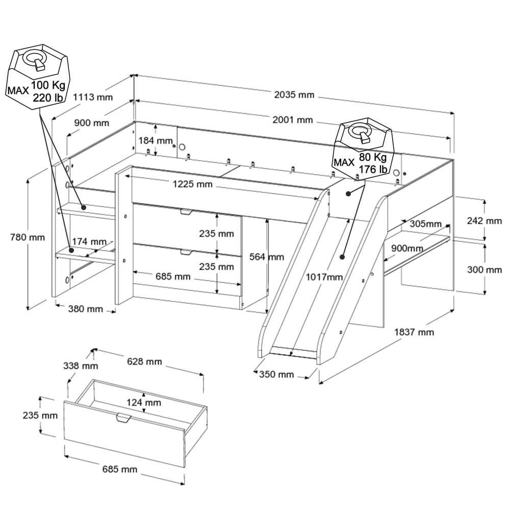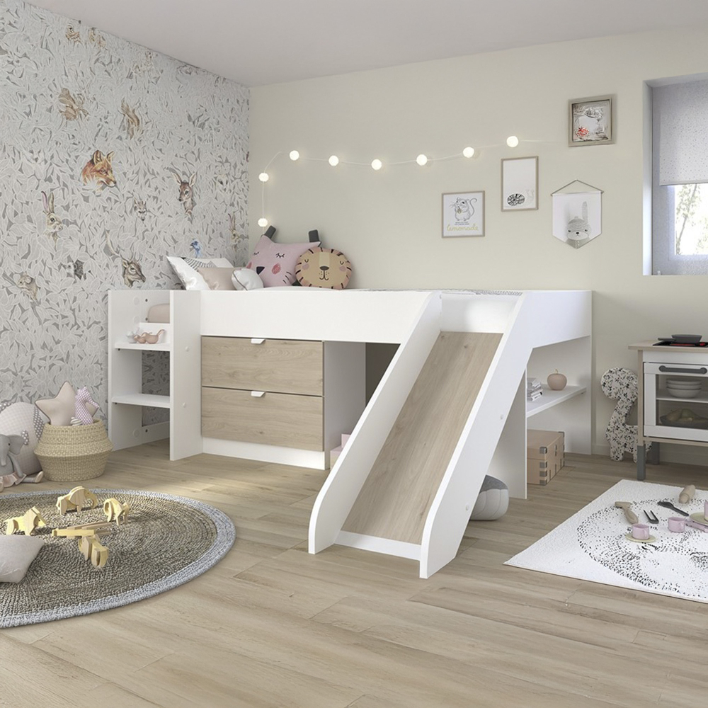 A cama alta ESCORREGA combina estrutura em painel de partículas com acabamento branco mate e detalhes em madeira clara. Inclui duas gavetas amplas, prateleiras laterais, degraus estáveis e um escorrega integrado.