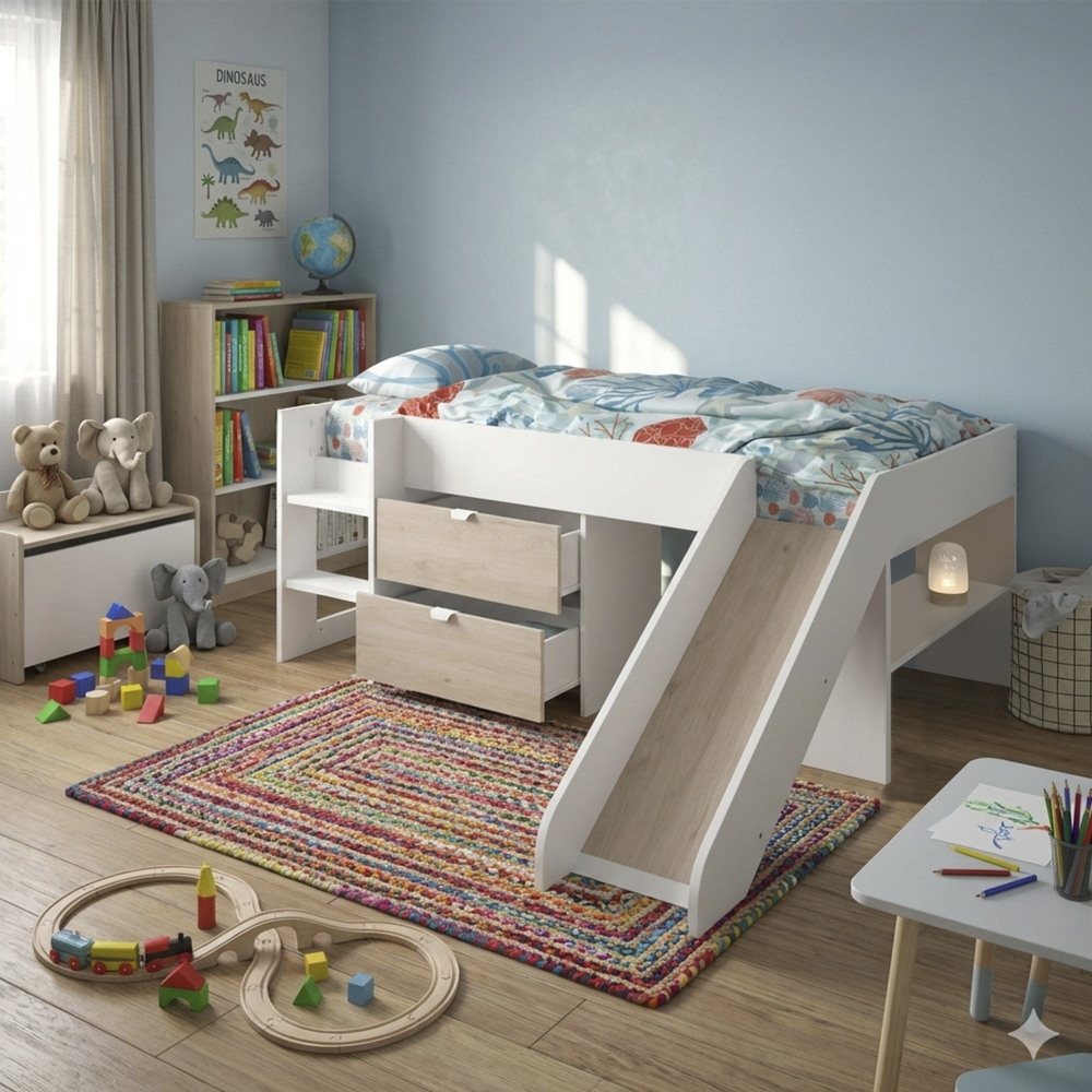 Cama alta ESCORREGA combina arrumação prática e diversão num design seguro e moderno.