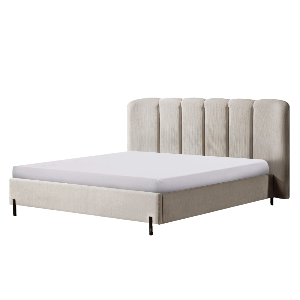 Com uma cabeceira alta estofada em tecido suave, esta cama proporciona apoio ergonómico para momentos de leitura ou relaxamento. A combinação entre a madeira sólida e o revestimento têxtil cria um equilíbrio perfeito entre firmeza e conforto, adaptando-se facilmente a diferentes estilos de decoração.