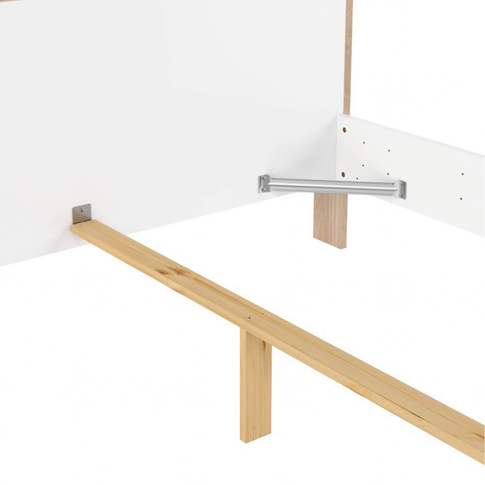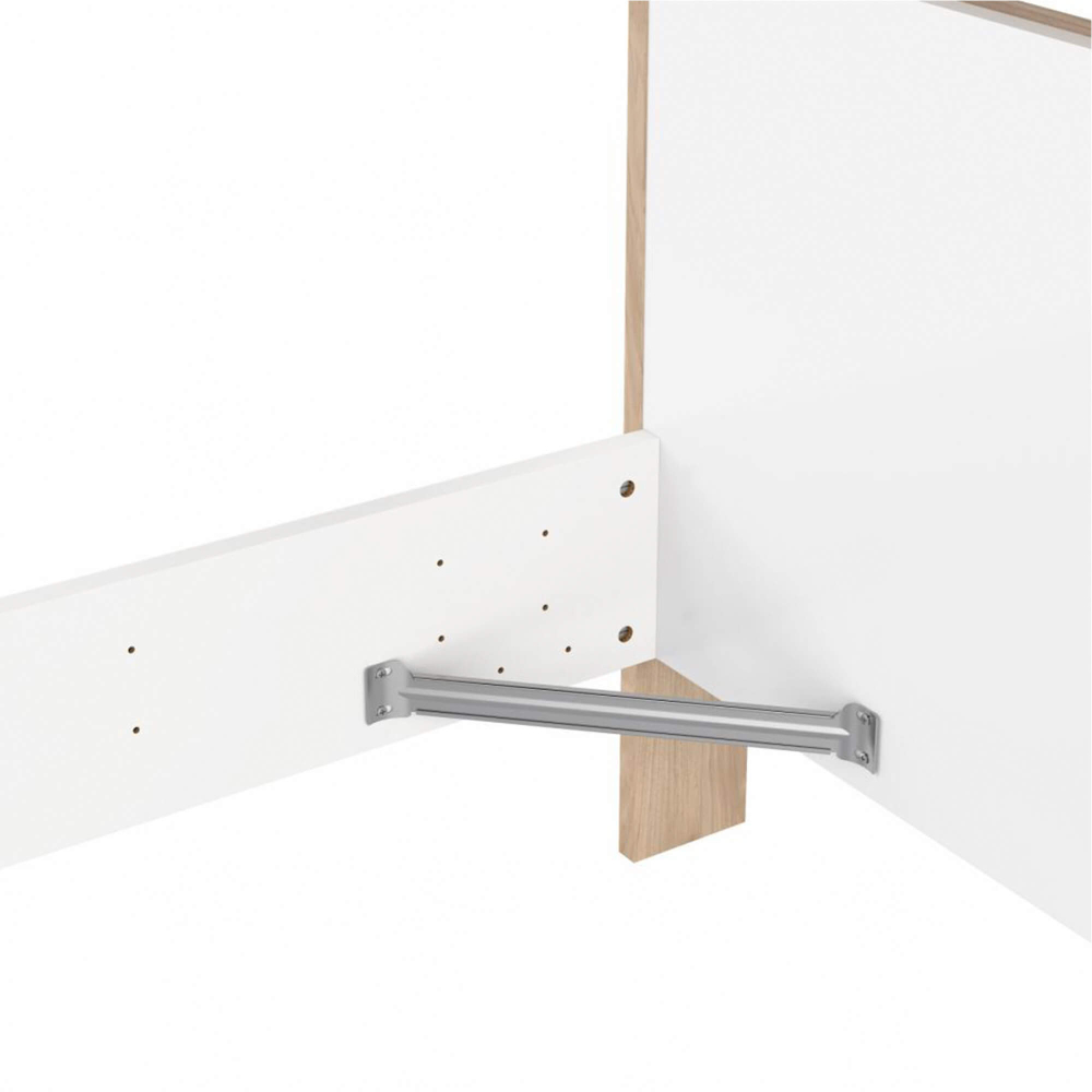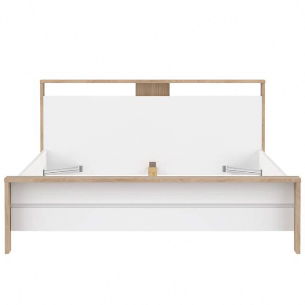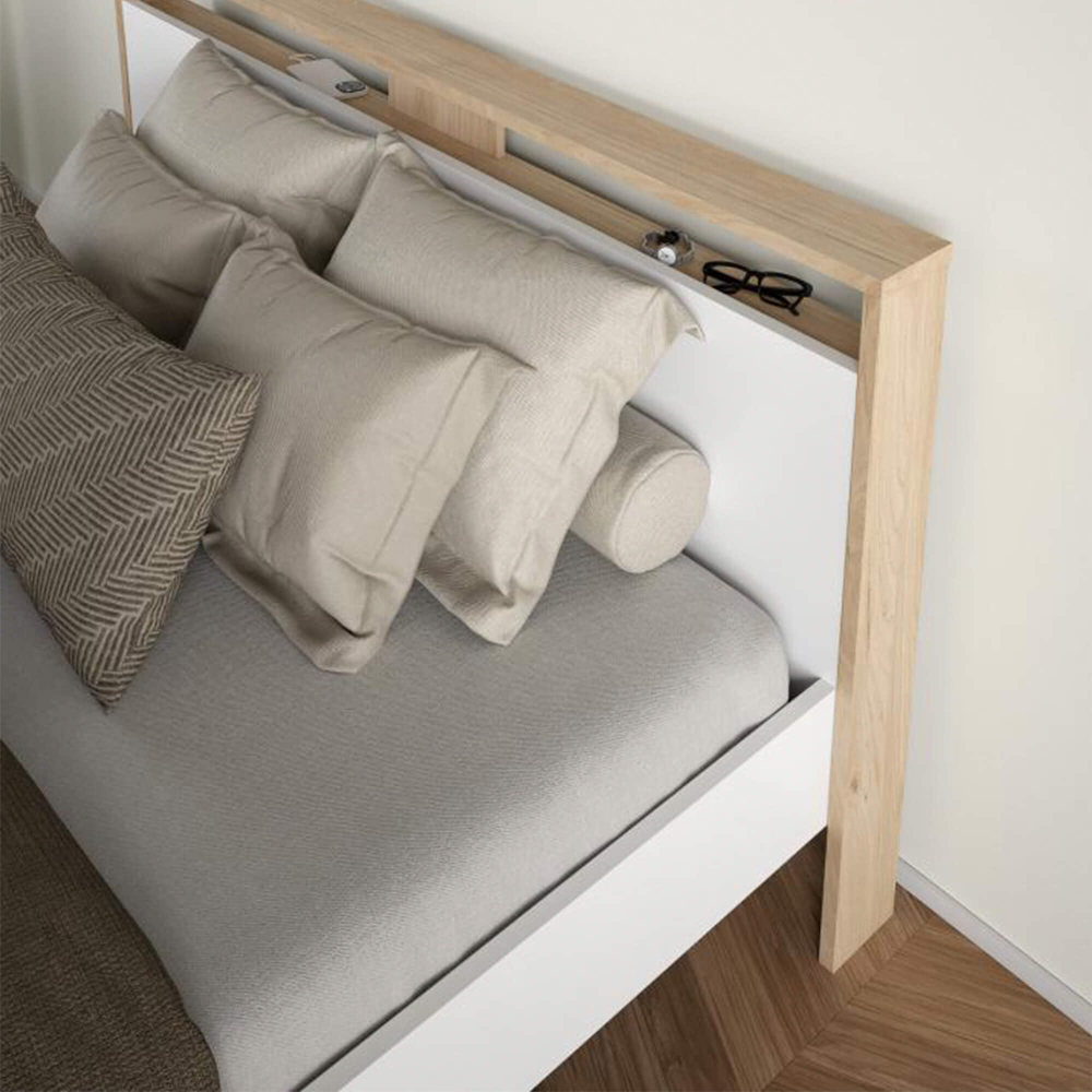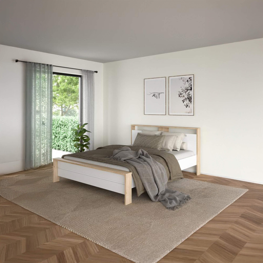 A cama de casal NEXT apresenta uma estrutura em branco com contornos em madeira clara. A cabeceira emoldurada confere leveza ao design e destaca-se pela simplicidade elegante. A base reforçada com travessas metálicas e apoio central garante estabilidade duradoura.