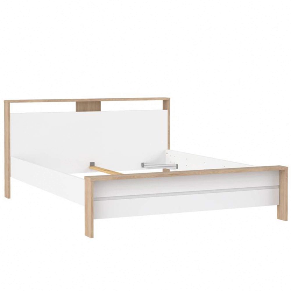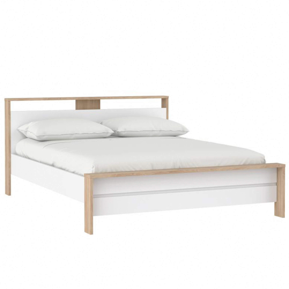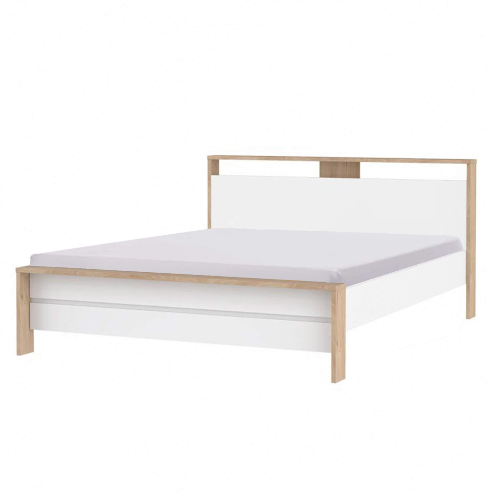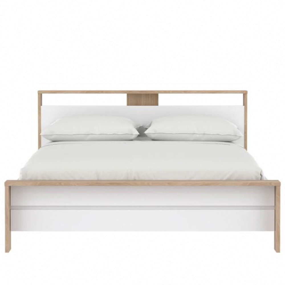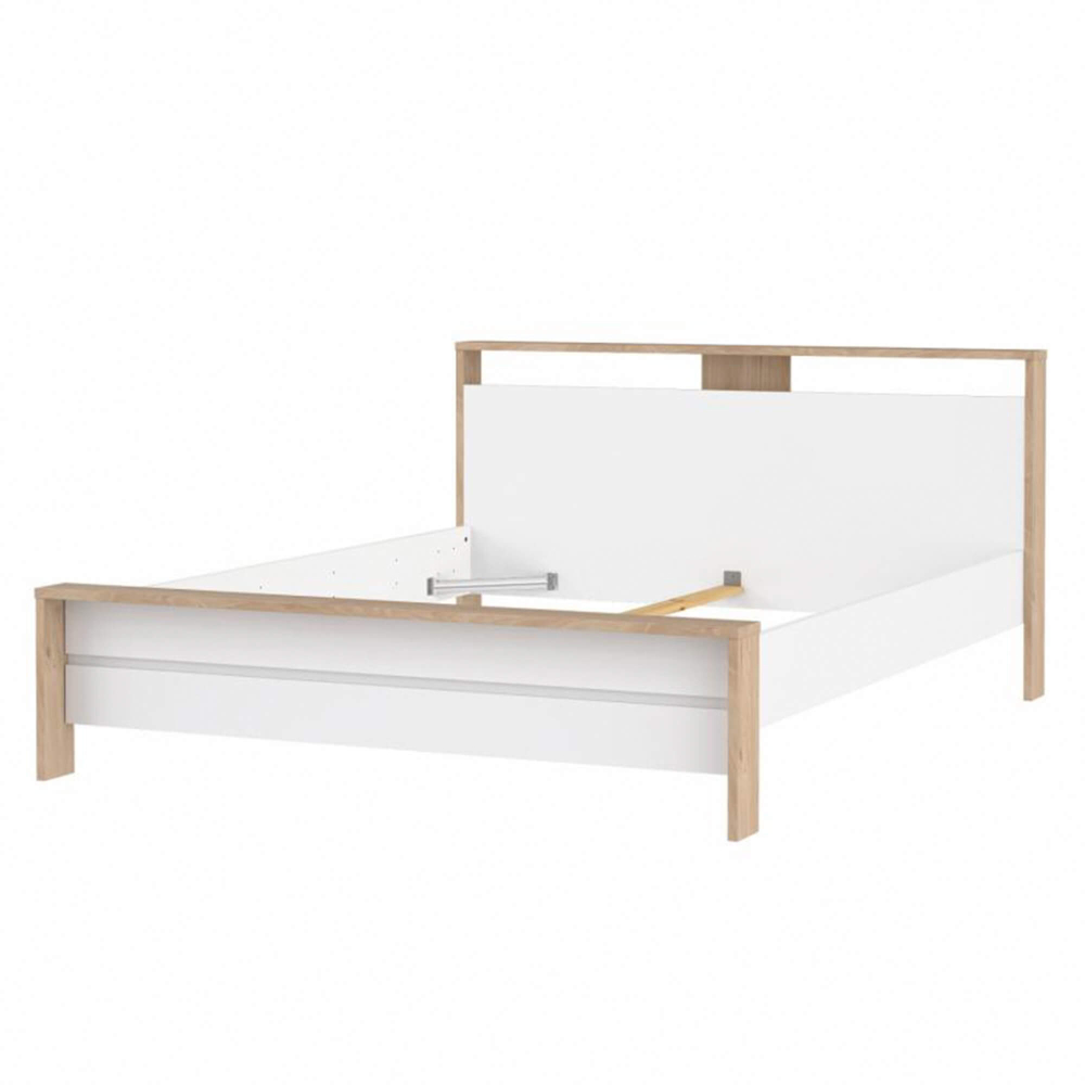 A cama de casal NEXT apresenta uma estrutura em branco com contornos em madeira clara. A cabeceira emoldurada confere leveza ao design e destaca-se pela simplicidade elegante. A base reforçada com travessas metálicas e apoio central garante estabilidade duradoura.
