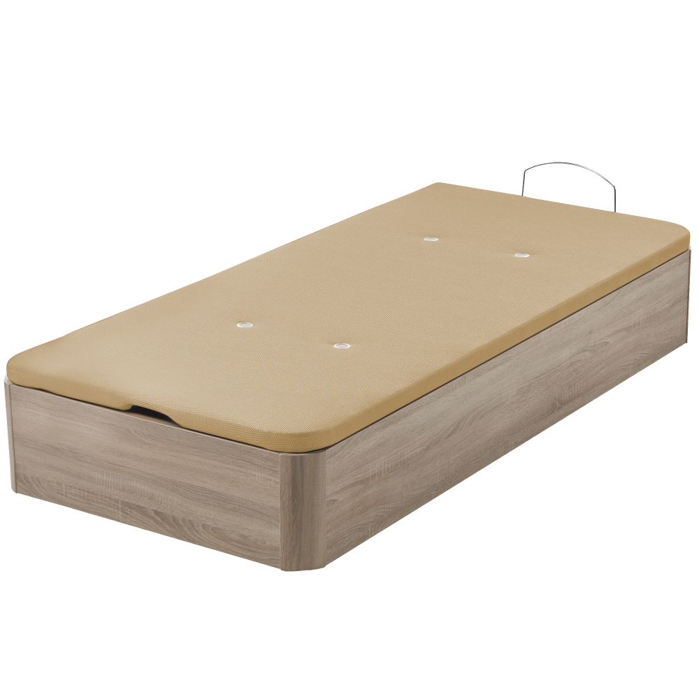 Este sommier de camas de solteiro destaca-se pela sua estrutura robusta em madeira de 25 mm e pelo tampo revestido em tecido 3D respirável, com 4 respiradores que garantem ventilação adequada. O sistema de abertura frontal com amortecedores torna o acesso ao interior suave e prático. A pega em madeira confere-lhe um toque sofisticado. Está disponível em várias cores e medidas, adaptando-se facilmente a diferentes estilos de quartos.