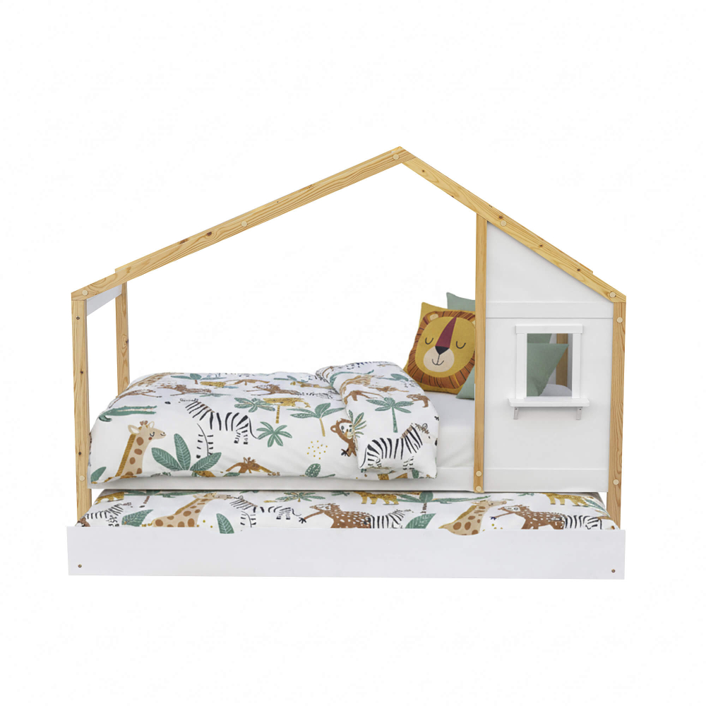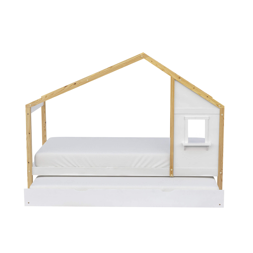 Com o seu formato de casinha, esta cama convida as crianças a imaginar aventuras todos os dias, seja fingindo ter um pequeno lar de brincadeira ou um forte de faz de conta. As cores suaves em branco e carvalho natural permitem que a cama se integre facilmente em qualquer decoração infantil, criando um ambiente calmo e acolhedor. Fabricada com materiais de qualidade – estrutura sólida em madeira de pinho maciça e acabamento em melamina – garante estabilidade e durabilidade para acompanhar o crescimento dos pequenos com toda a segurança. Além disso, o estrado está embutido na estrutura, o que significa que a cama já vem pronta a receber o colchão sem necessidade de peças adicionais, facilitando a montagem e oferecendo suporte ideal para noites de sono aconchegantes.