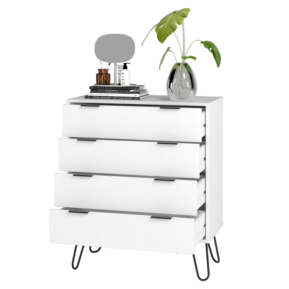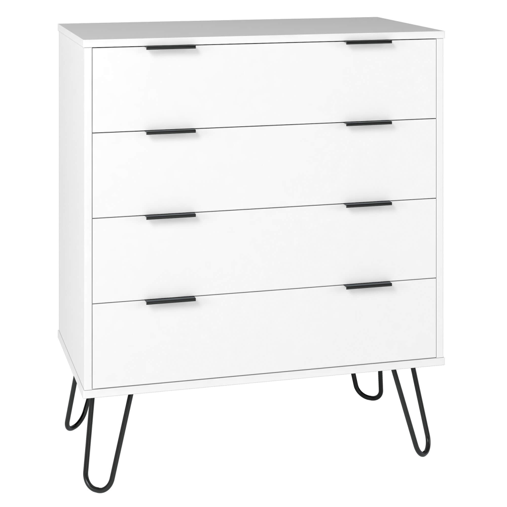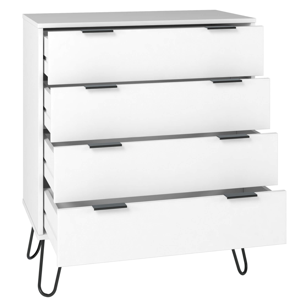 Com design moderno e acabamento branco, a cómoda CASSIE adapta-se facilmente a qualquer decoração, desde ambientes minimalistas até espaços com estilo industrial. As suas 4 gavetas amplas oferecem arrumação funcional e prática, enquanto a estrutura em painel de partículas garante resistência e estabilidade. Os pés metálicos de 20 cm conferem leveza visual e facilitam a limpeza. Esta cómoda é uma combinação equilibrada entre estética, durabilidade e conforto de utilização.
