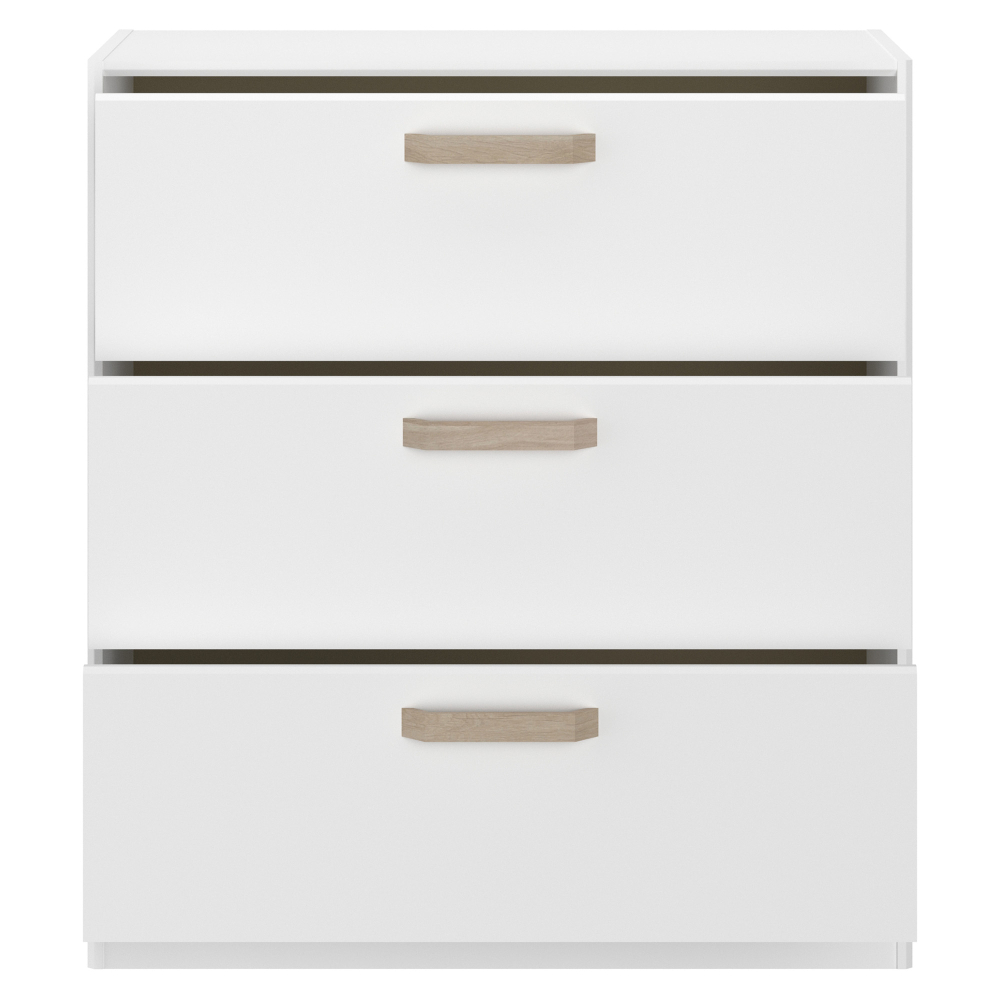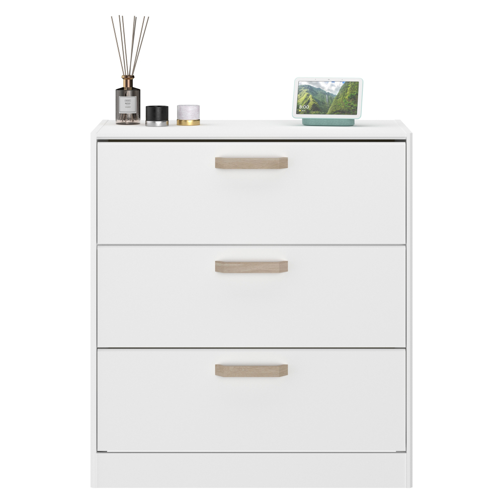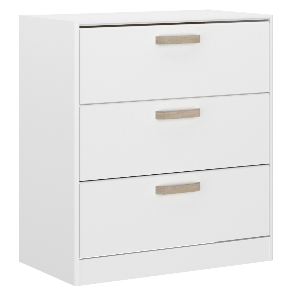 A Cómoda DREAM com 3 gavetas apresenta uma estrutura moderna em branco mate com puxadores em madeira clara, garantindo um look leve e versátil para qualquer quarto. As três gavetas amplas oferecem arrumação funcional para roupa, acessórios e objetos do dia a dia, mantendo o espaço sempre organizado.