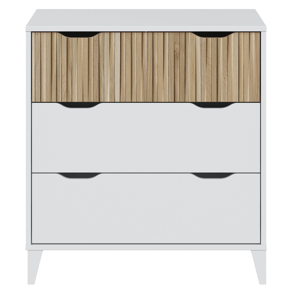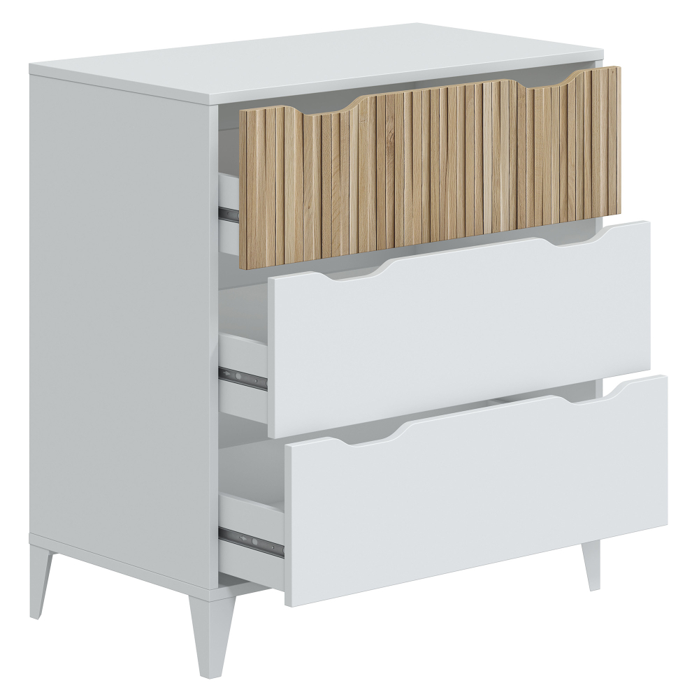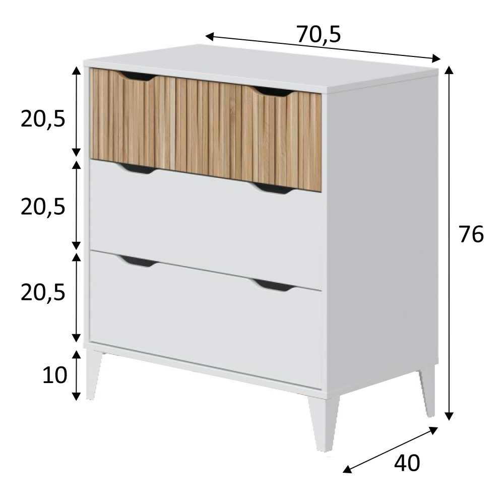 Com estrutura em painel de partículas de 15 mm, fundos em MDF e acabamento lacado revestido em melamina, a cómoda NOITE com 3 gavetas alia resistência e design moderno. As gavetas deslizam suavemente em corrediças metálicas, oferecendo facilidade de uso e durabilidade. O destaque vai para a combinação harmoniosa entre o branco e o padrão amadeirado, que confere um toque contemporâneo e acolhedor. Os pés em ABS, além de reforçarem a estabilidade, facilitam a limpeza por baixo do móvel — um detalhe essencial para o dia a dia. Esta cómoda combina estética e funcionalidade, tornando-se uma peça indispensável na decoração do quarto.