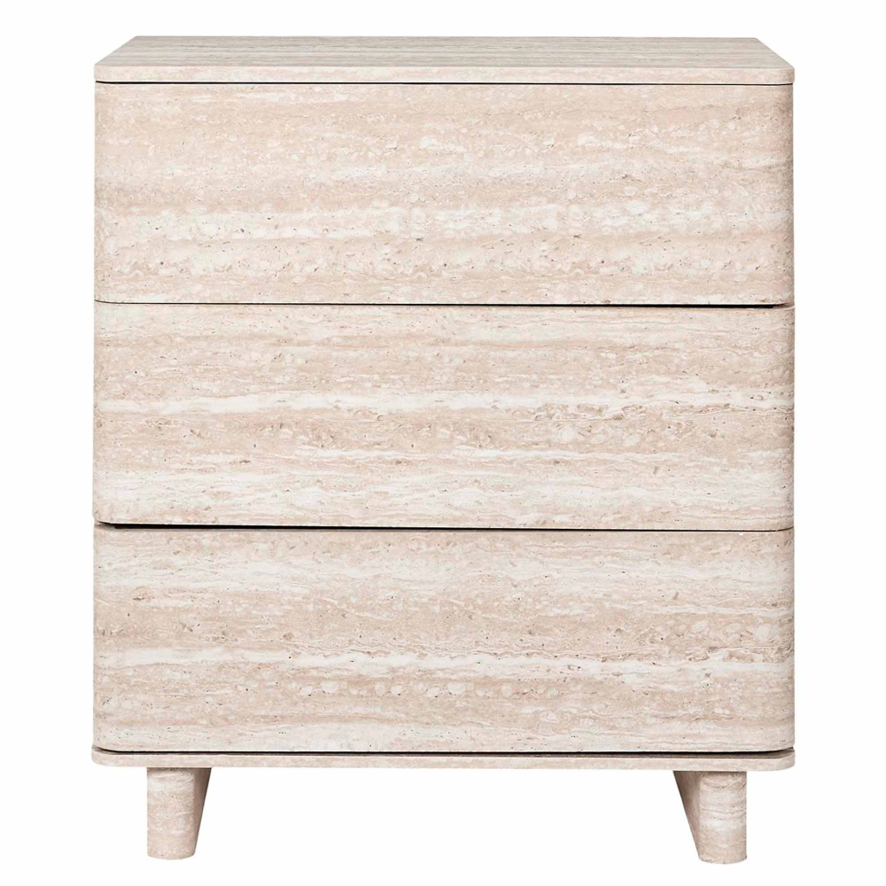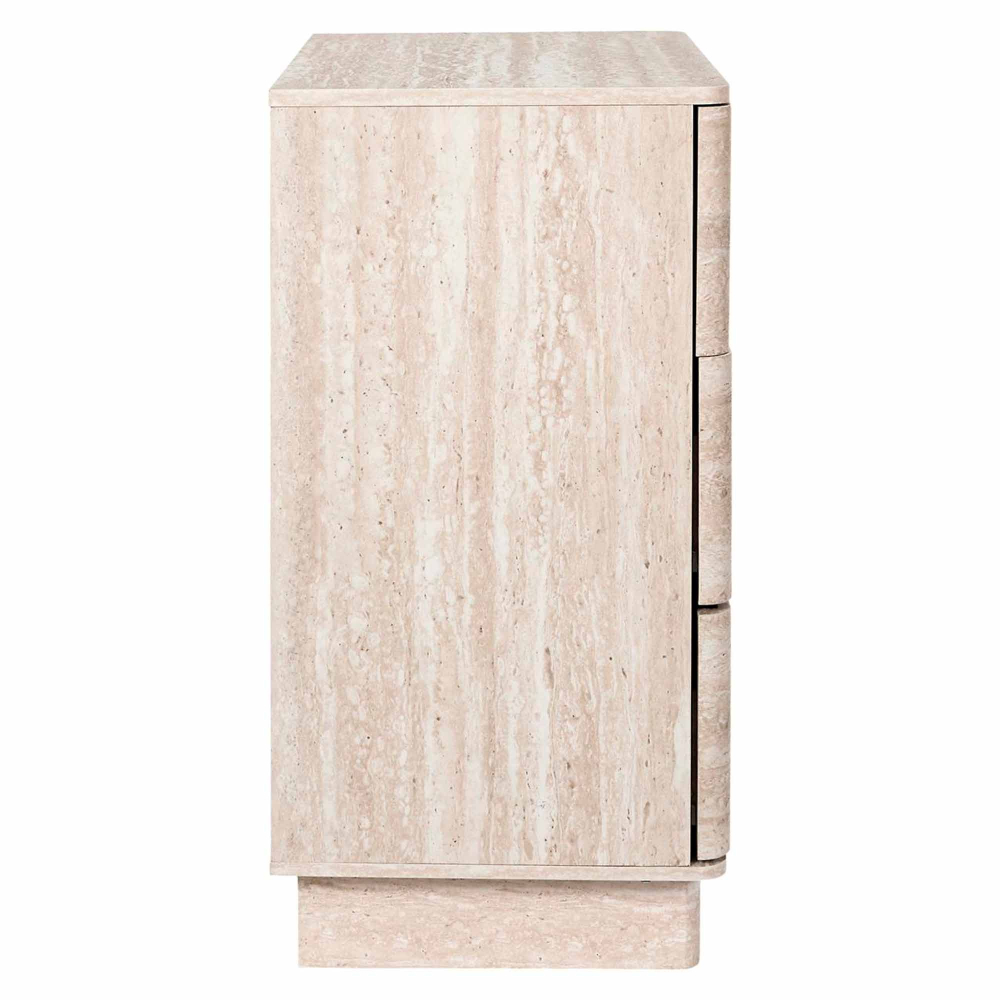 O acabamento estilo travertino adiciona um toque de luxo a qualquer ambiente. As gavetas amplas permitem organizar facilmente roupa e acessórios. As frentes curvas tornam o design mais suave e moderno. A estrutura sólida assegura durabilidade para uso diário e uma aparência sempre impecável.