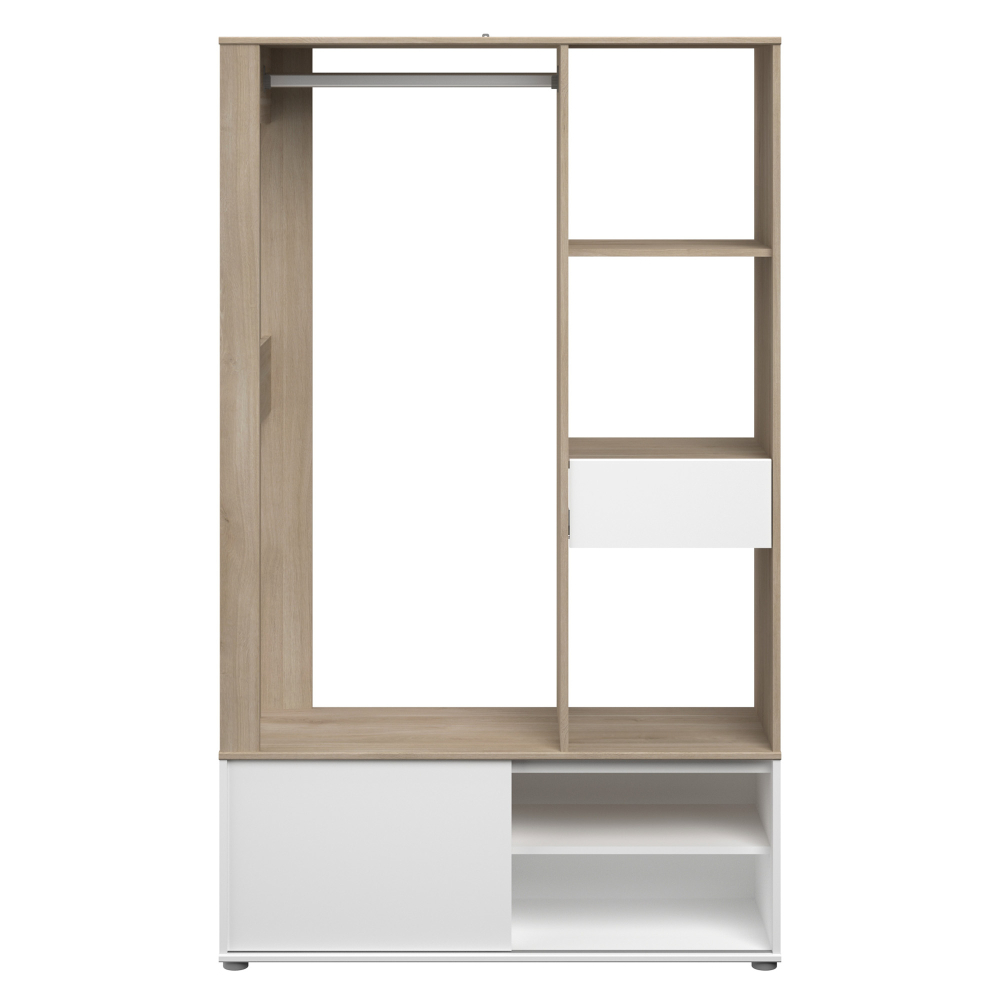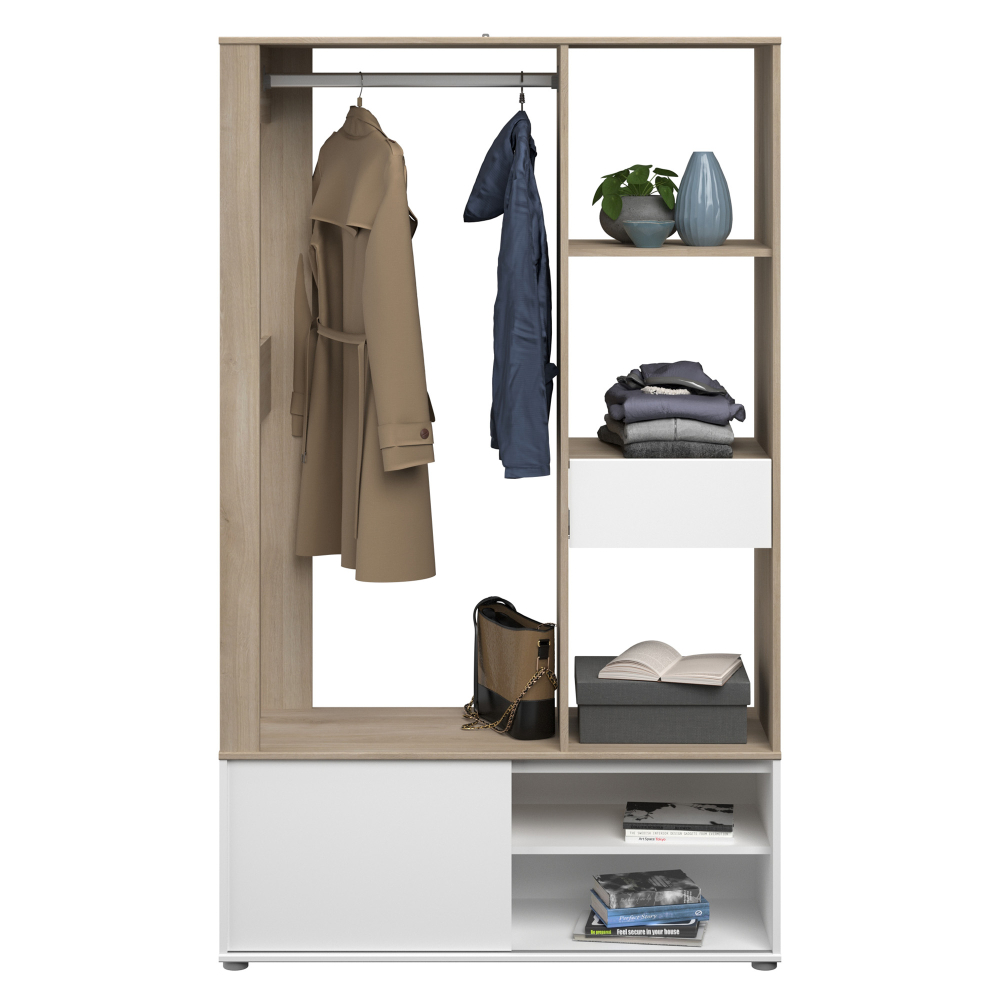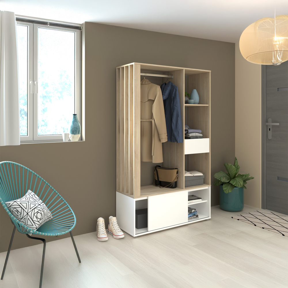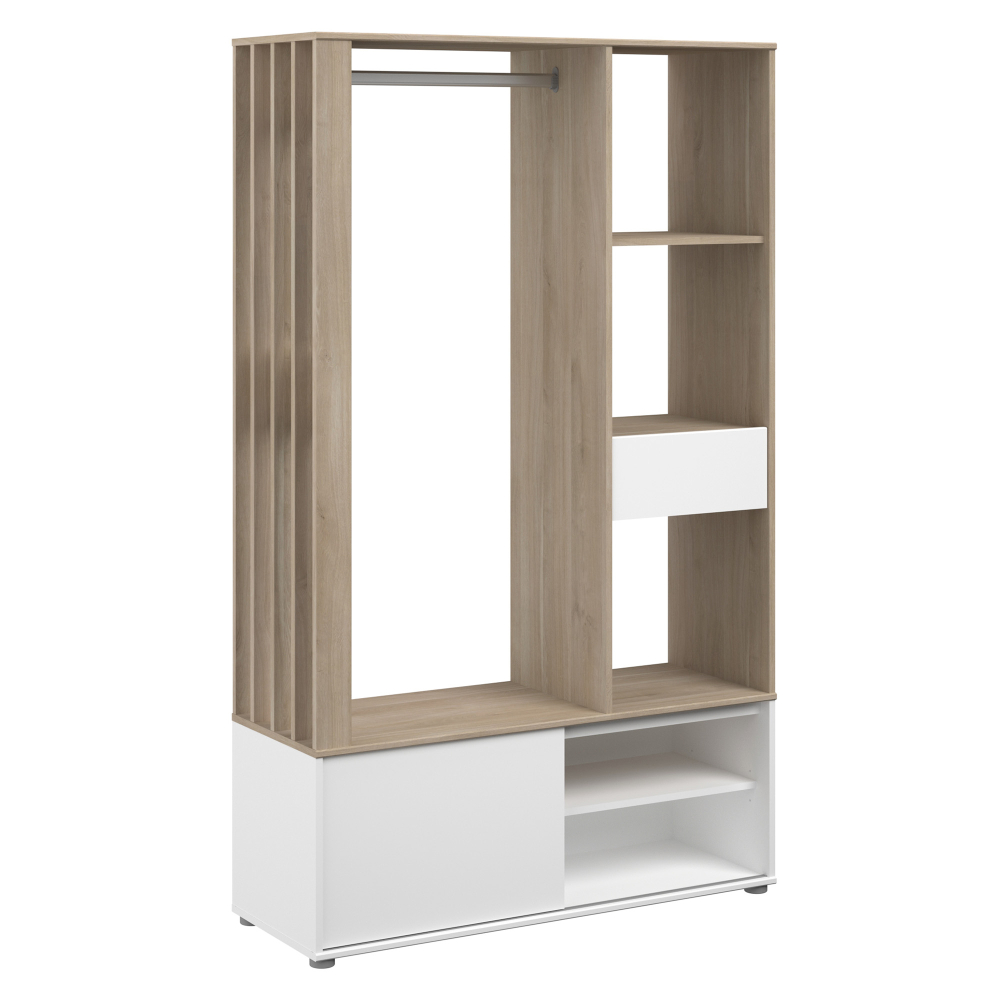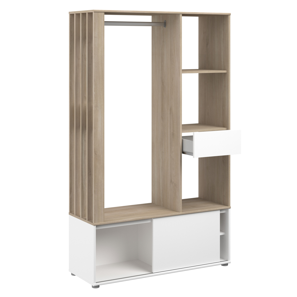 O móvel de entrada GHOST inclui uma estrutura em painel de partículas com acabamento em madeira clara e branco, um bengaleiro com barra metálica, prateleiras abertas e uma gaveta integrada. A base possui portas deslizantes e nichos amplos que permitem manter acessórios e calçado bem organizados logo à entrada da casa.