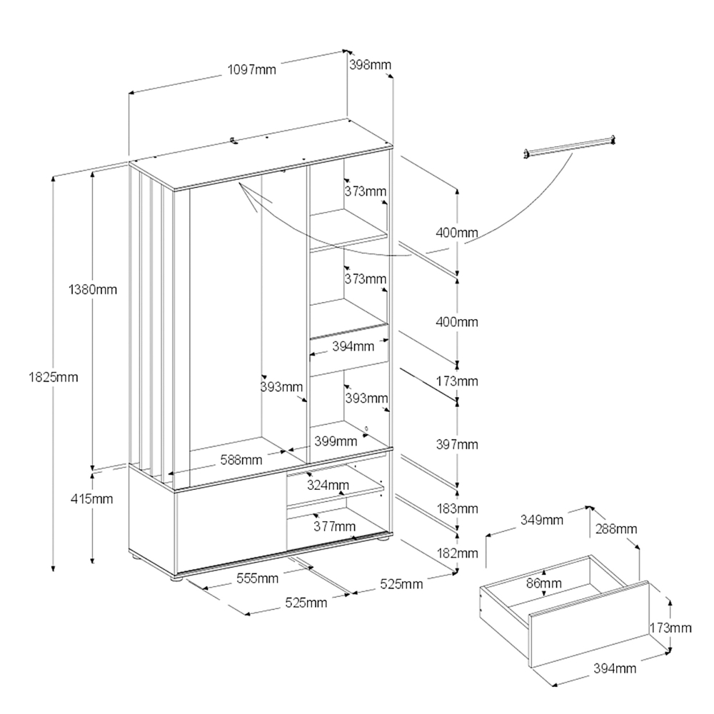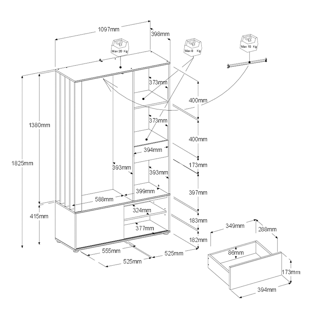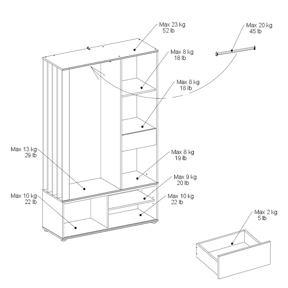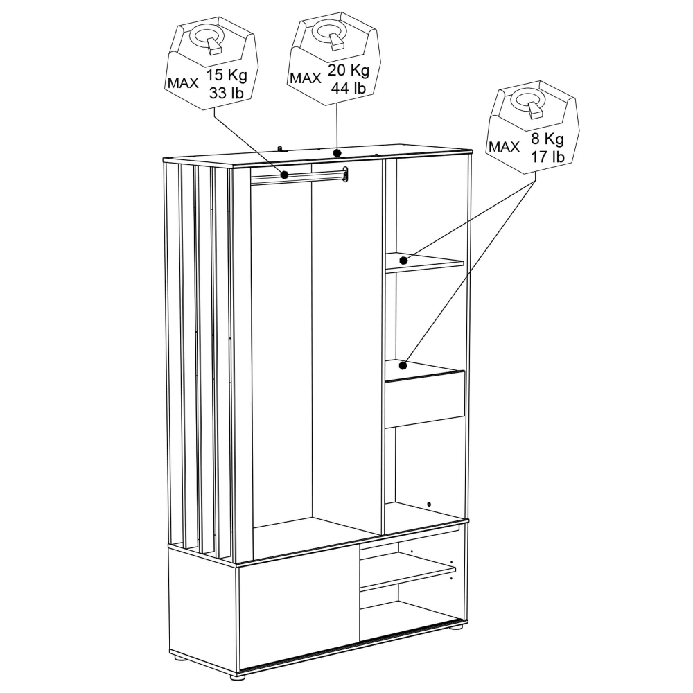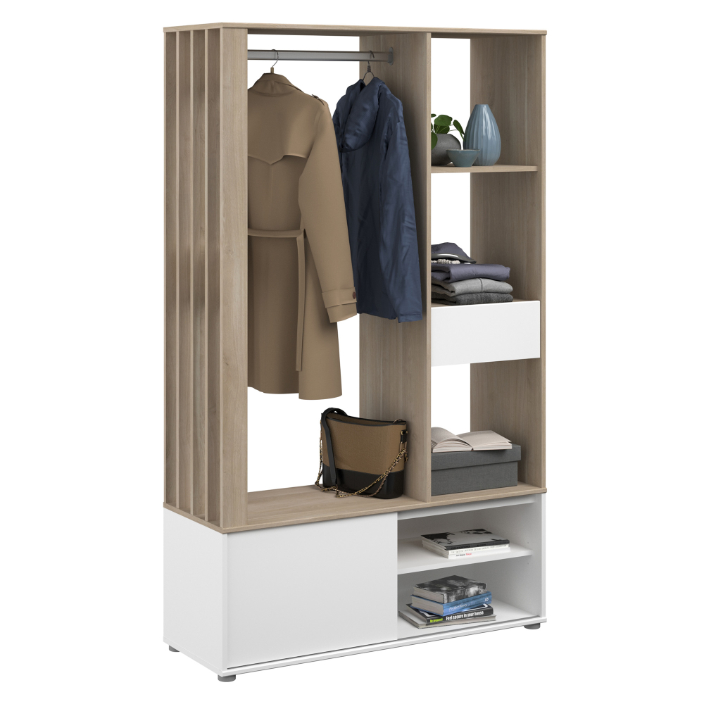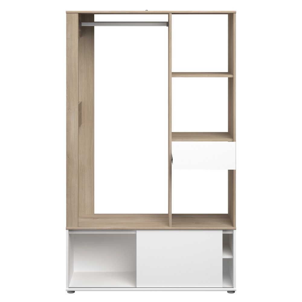 O móvel de entrada GHOST inclui uma estrutura em painel de partículas com acabamento em madeira clara e branco, um bengaleiro com barra metálica, prateleiras abertas e uma gaveta integrada. A base possui portas deslizantes e nichos amplos que permitem manter acessórios e calçado bem organizados logo à entrada da casa.