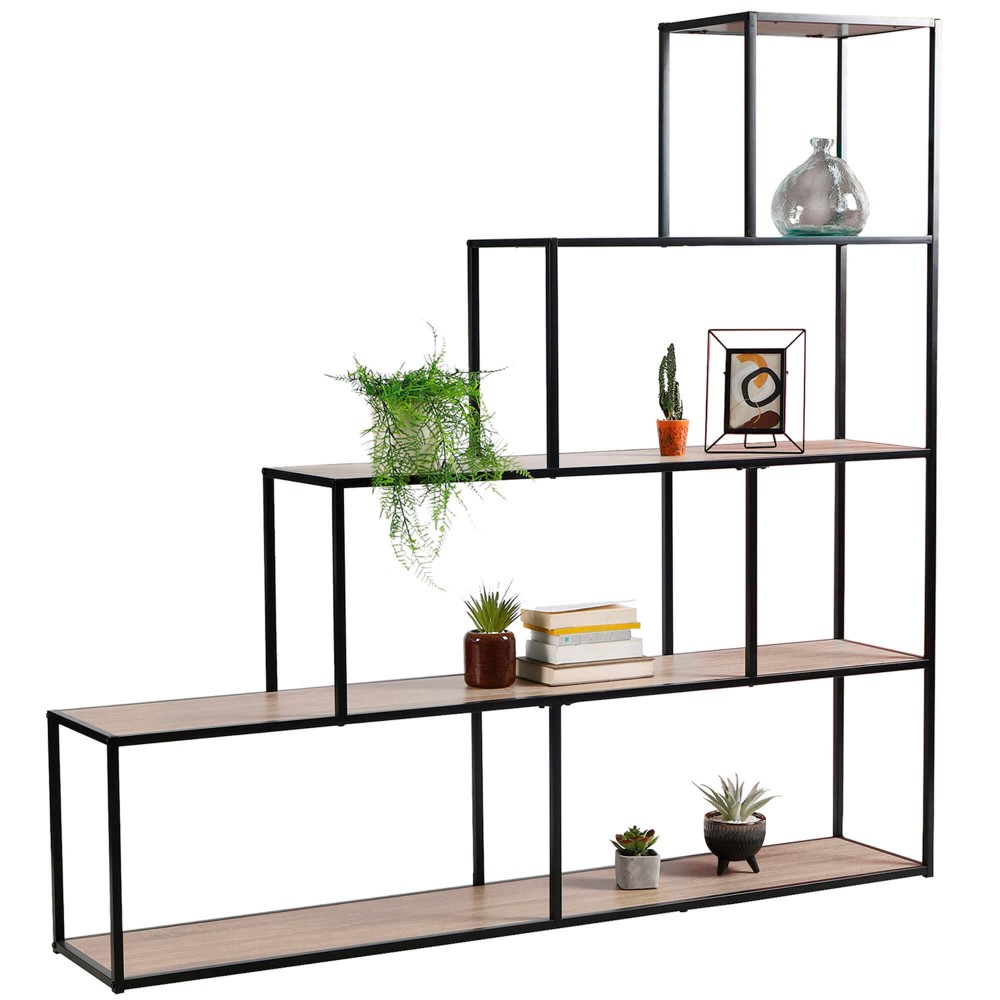 A estante COLORADO em escada destaca-se pela estrutura metálica preta combinada com prateleiras em painel de partículas com acabamento carvalho, garantindo leveza visual e estabilidade. O design escalonado permite distribuir peças maiores nas prateleiras inferiores e detalhes decorativos nas superiores, tornando a estante funcional e decorativa ao mesmo tempo. Além disso, a versatilidade da gama COLORADO permite integrar esta estante em qualquer estilo moderno.