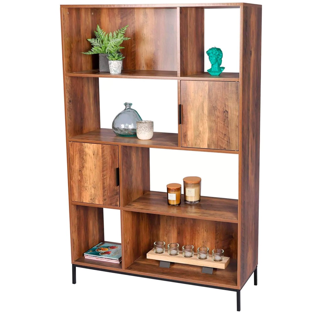 Com uma estrutura em painel de partículas revestida por poliuretano, esta estante destaca-se pela resistência, pelo acabamento estilo nogueira e pelos pés metálicos que elevam o design. Os 8 compartimentos, as 4 prateleiras e as 2 portas oferecem uma versatilidade impressionante, tornando esta estante ideal para exposição de peças decorativas e arrumação discreta. Além disso, a película de poliuretano torna a estante mais robusta e resistente à humidade e aos riscos.