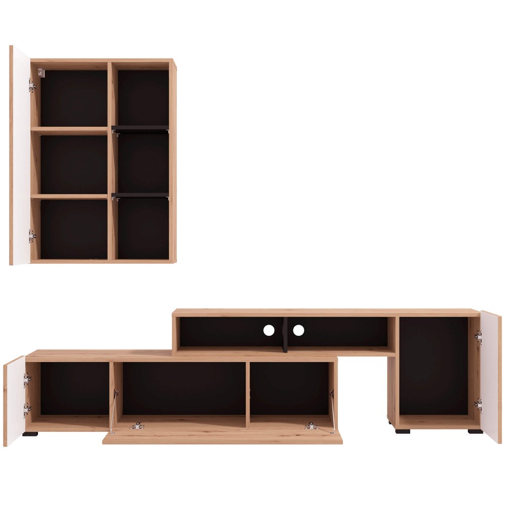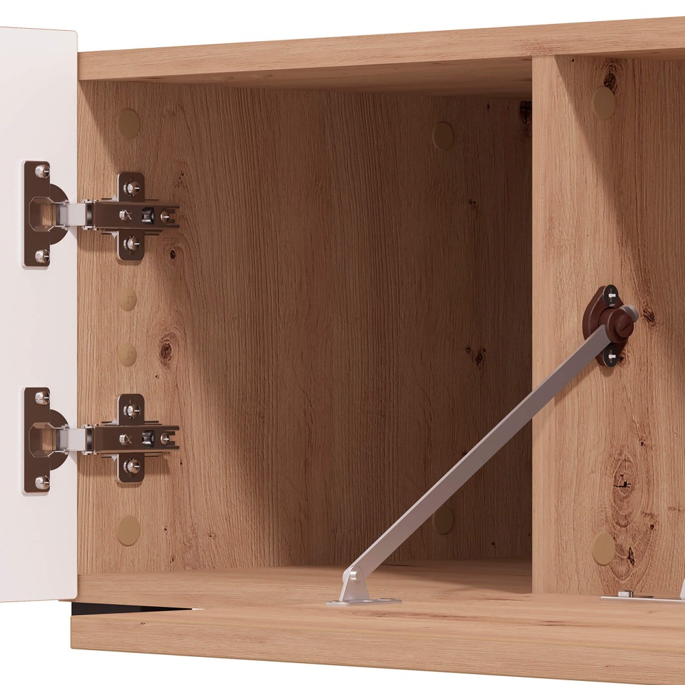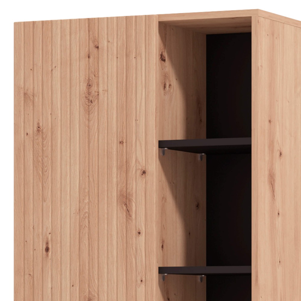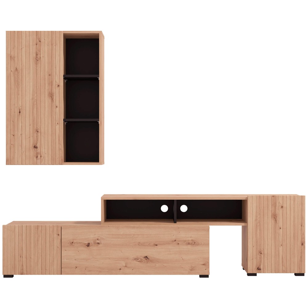 O conjunto destaca-se pelo design robusto em painel de partículas e MDF, acabamento mate com efeito ripado e uma composição funcional que combina 4 portas, 4 prateleiras e um módulo suspenso. A estante oferece capacidade para TVs até 55", suporta boa carga no tampo e nas prateleiras e traz aquele toque moderno que transforma imediatamente a sala. Além disso, é uma estante prática, segura graças à fixação obrigatória à parede, e versátil ao distribuir o arrumo de forma inteligente. No total, esta estante junta estética, funcionalidade e estabilidade num só conjunto.