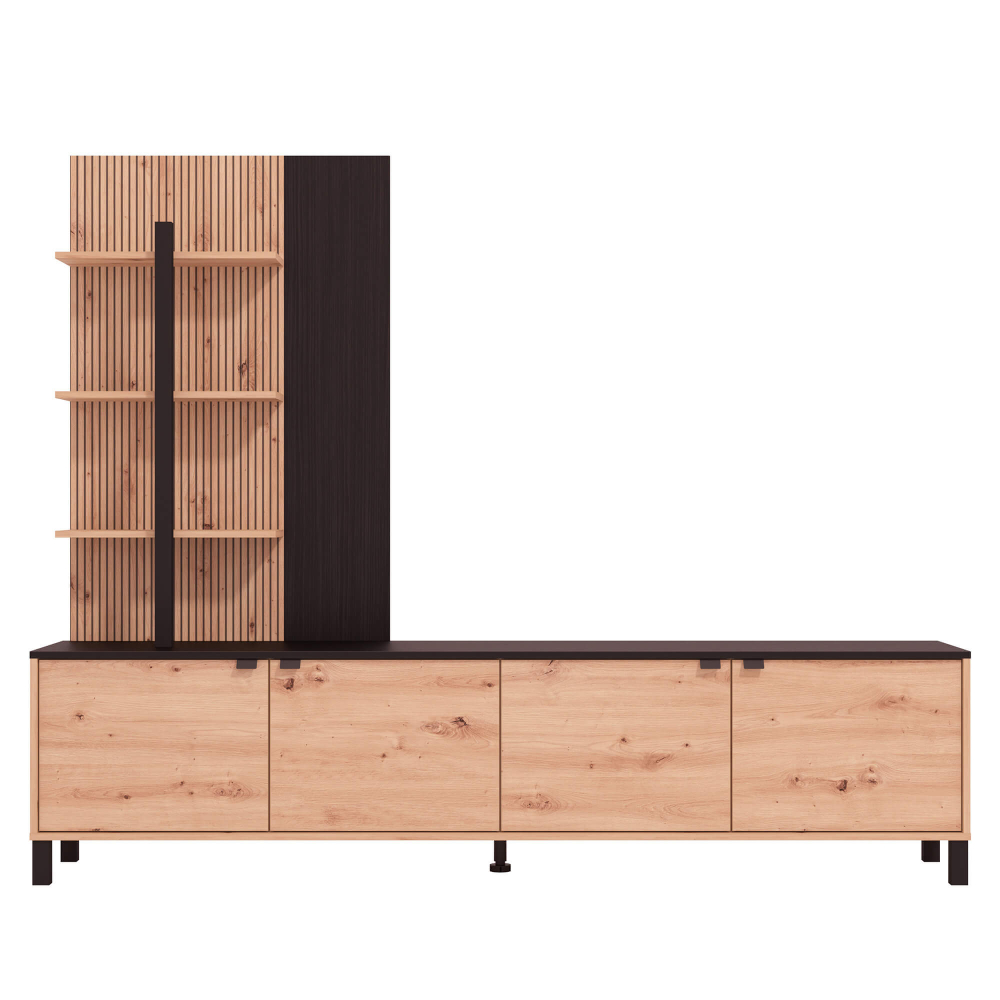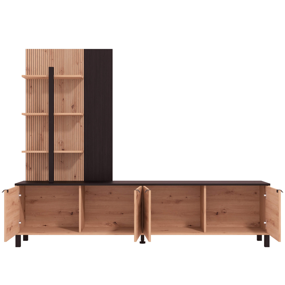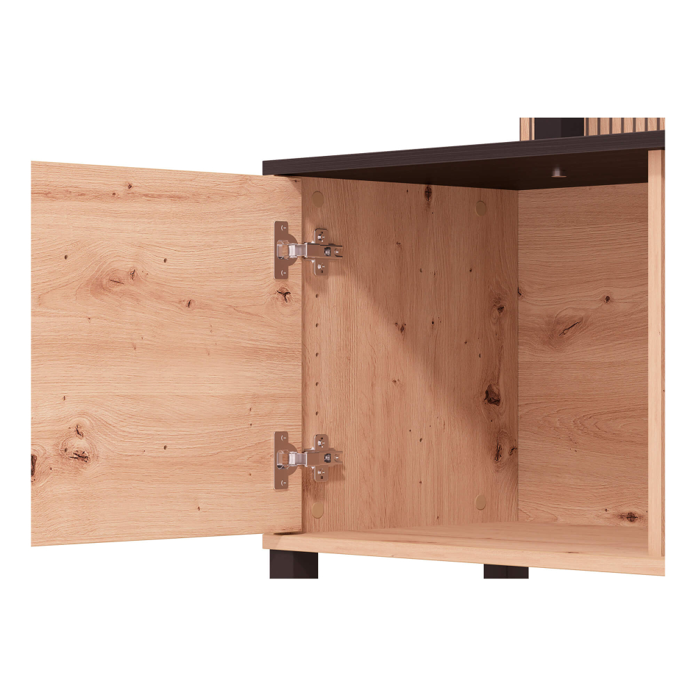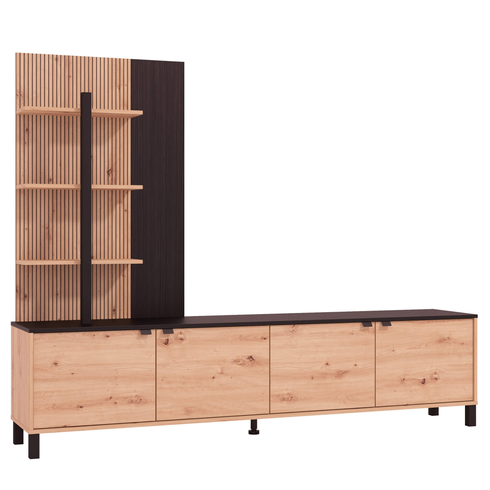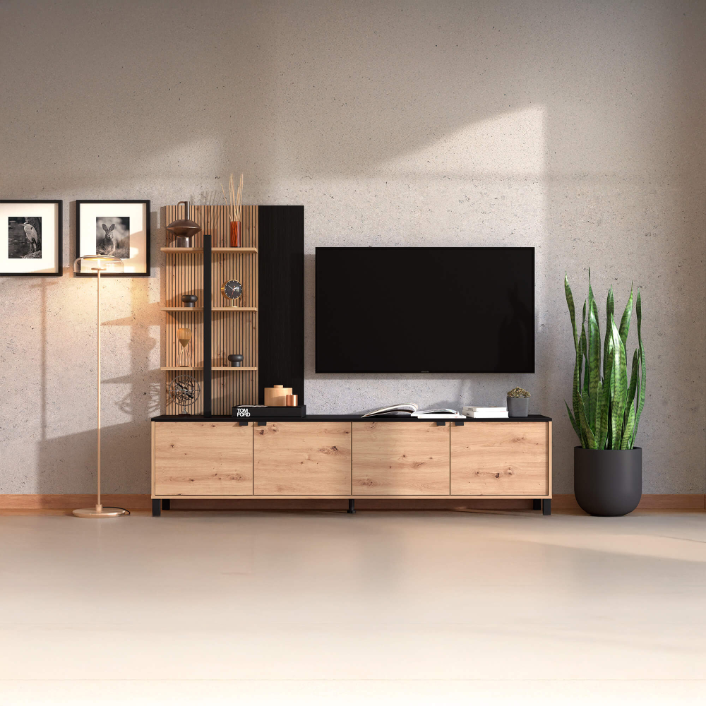 O móvel de TV MARGATE traz um equilíbrio perfeito entre design e funcionalidade. Com acabamento em carvalho natural e detalhes em preto mate, este móvel combina estética contemporânea com uma estrutura prática e inteligente. As portas escondem compartimentos espaçosos, ideais para manter a sua sala sempre organizada, enquanto o painel com prateleiras verticais acrescenta personalidade e versatilidade ao ambiente.