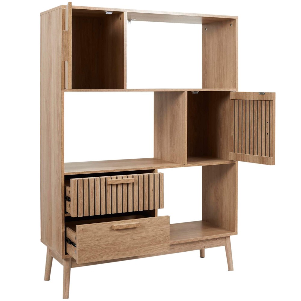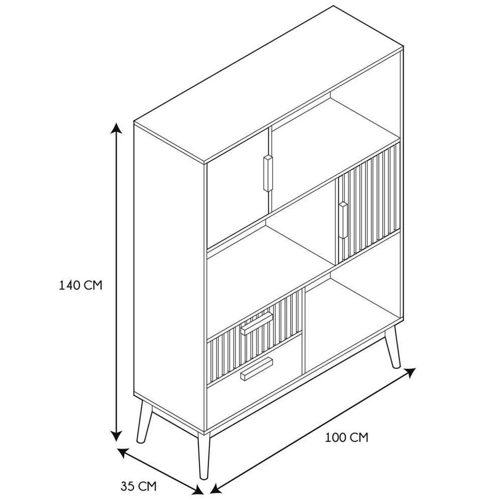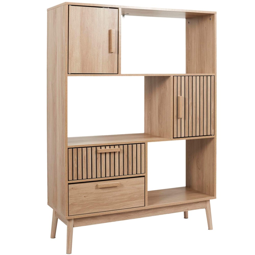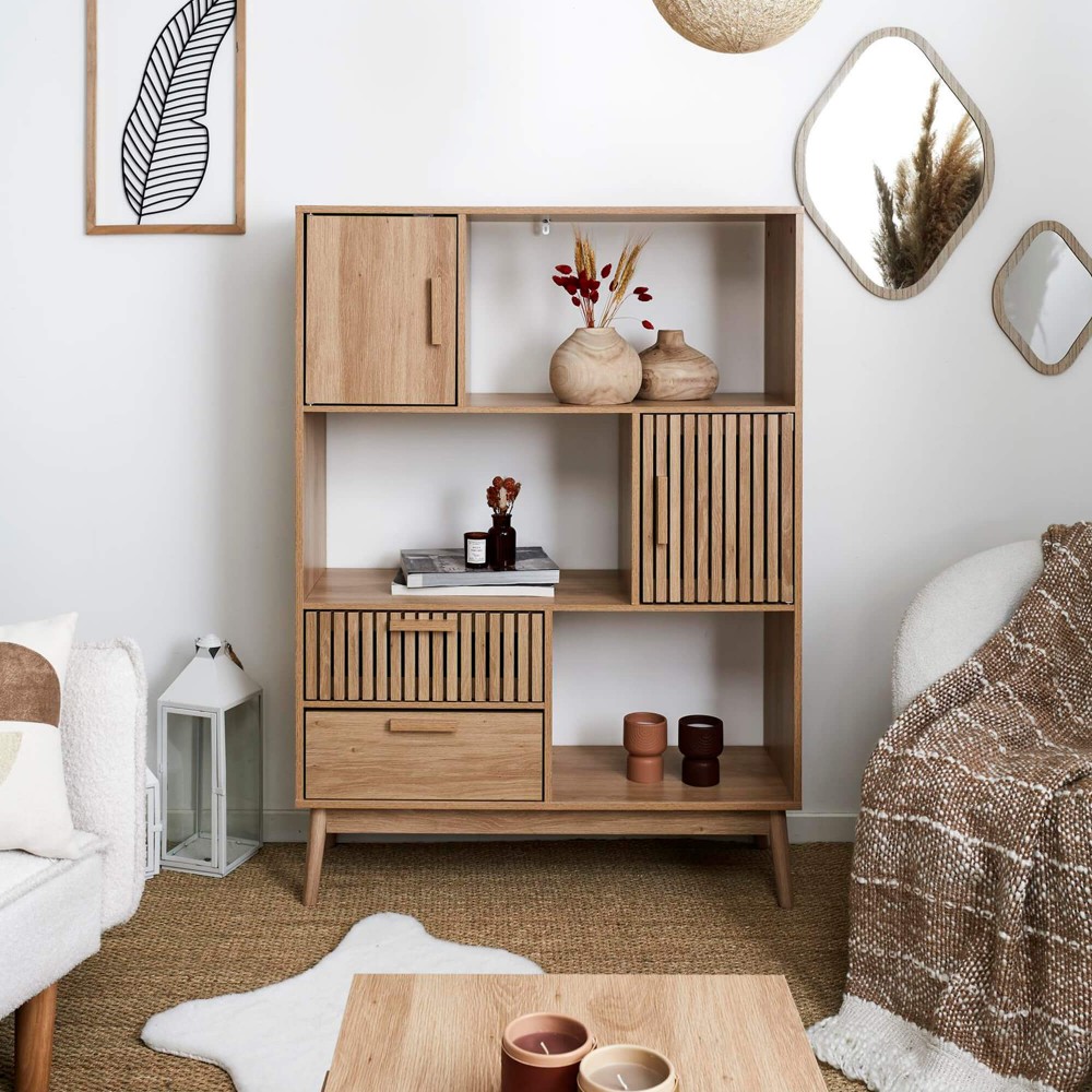 A estante KLAUS é perfeita para organizar e decorar diversos ambientes. Com uma estrutura robusta feita de painel de partículas, MDF e madeira de pinho, este móvel destaca-se pela sua durabilidade e resistência. A estante apresenta um acabamento elegante com duas portas de bater, sendo uma ripada e outra em carvalho, além de duas gavetas, uma com acabamento em carvalho e outra ripada. Conta ainda com cinco nichos abertos para arrumação ou exposição de objetos decorativos, por exemplo.
