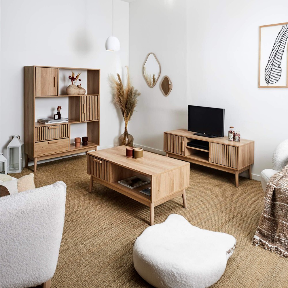 Estante KLAUS em carvalho com ripas nas portas e gavetas. Estante bonita e de fácil conjugação!