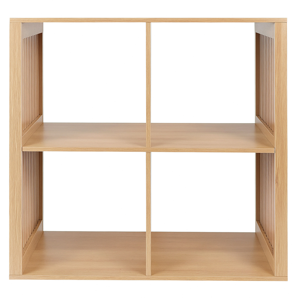 A estante KLAUS com 4 cubos é um mobiliário versátil e funcional, ideal para qualquer divisão da sua casa. Com uma estrutura em MDF e painel de partículas, esta estante possui um design moderno e elegante, destacando-se pelas suas laterais ripadas em carvalho que acrescentam um toque de sofisticação ao ambiente. As suas dimensões compactas e o formato de cubo proporcionam uma ótima solução de armazenamento, permitindo organizar livros, objetos decorativos, plantas, cestas ou qualquer outro item que deseje expor ou guardar.