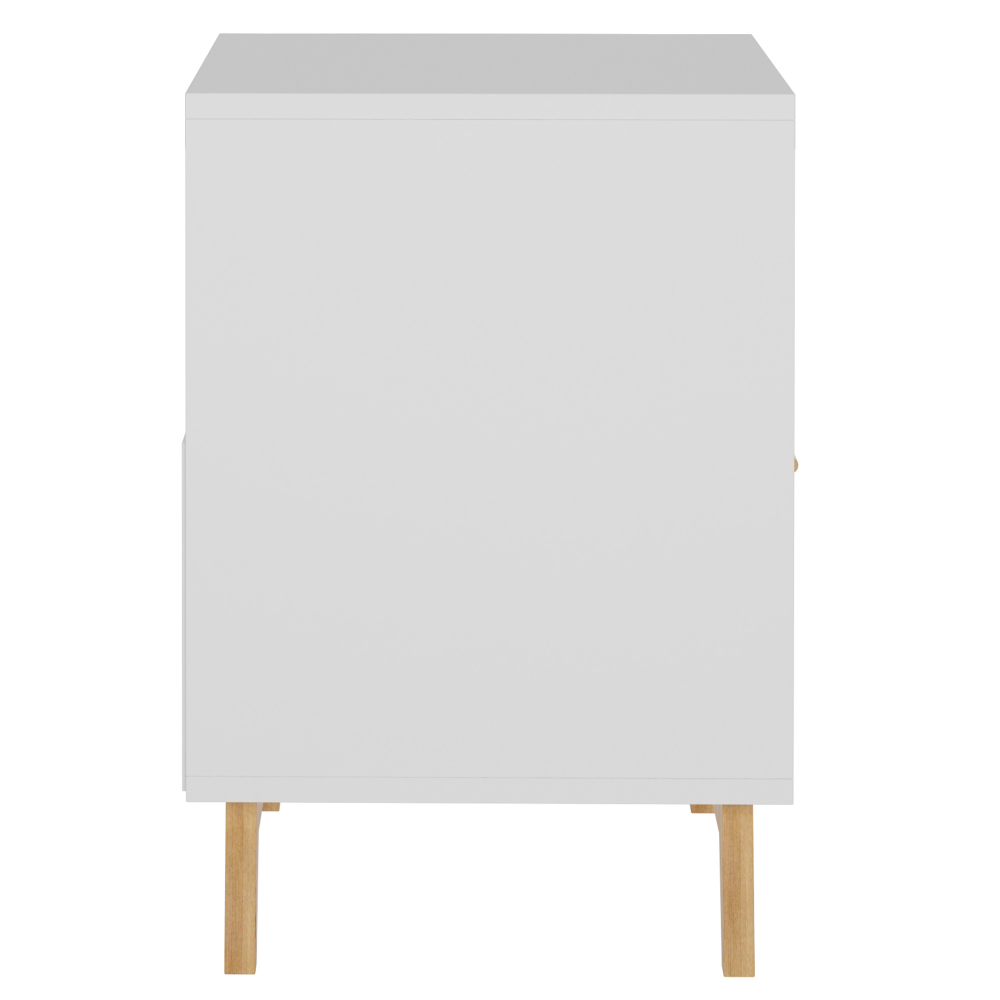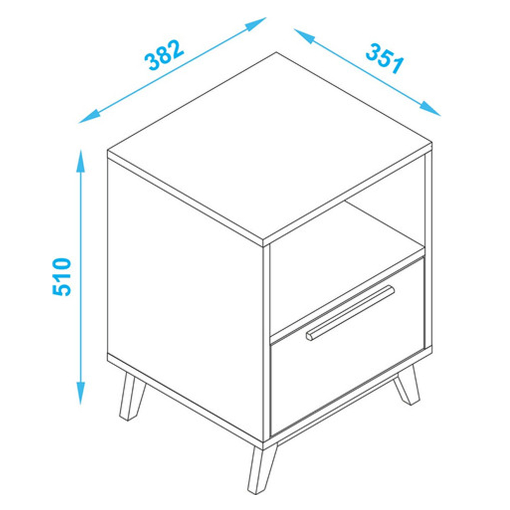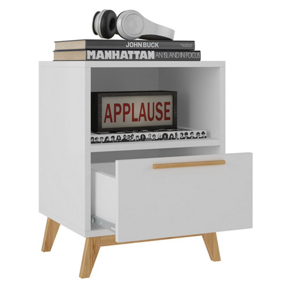 O contraste entre a estrutura clara e os pés em tom de madeira adiciona um toque natural e acolhedor ao espaço. A gaveta com puxador discreto permite uma abertura fácil e suave, enquanto o nicho aberto é perfeito para colocar livros, relógios ou elementos decorativos.