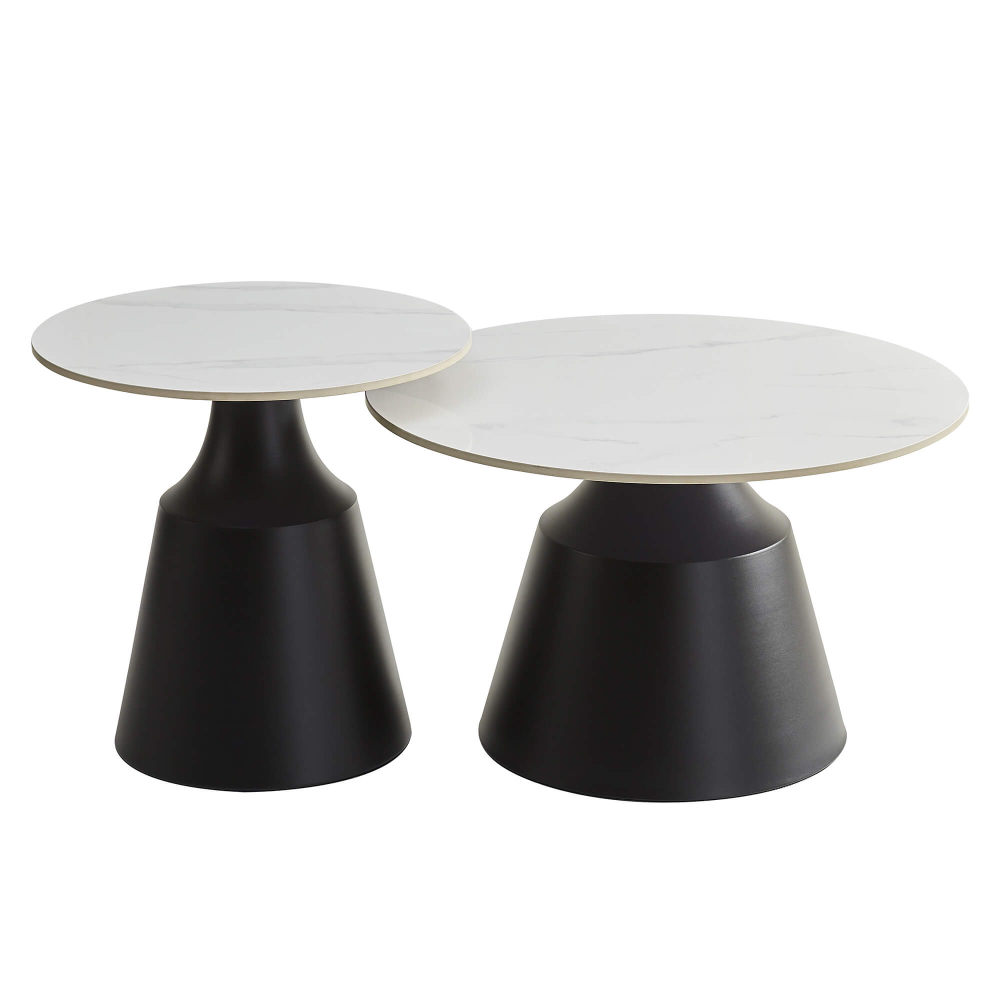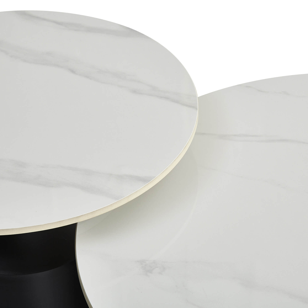 No segundo ponto, destaca-se o tampo em pedra sinterizada que oferece várias vantagens como resistência ao calor, imune a riscos do dia-a-dia, sem manchas, um material higiénico e antibacteriano, durabilidade a longo prazo, imita mármore com um realismo incrível e, ainda, é um material eco-friendly. As bases metálicas asseguram estabilidade e acrescentam um toque moderno, tornando o conjunto 2 mesas de centro LAUREN uma peça visualmente impactante. Além disso, o contraste entre o tampo claro e a base escura confere-lhe um aspeto requintado, adaptando o conjunto 2 mesas de centro a salas minimalistas ou ambientes mais decorados.