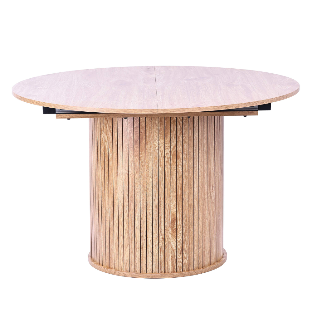 A mesa extensível GORDON destaca-se pelo seu design moderno e funcional, combinando elegância e praticidade. Com tampo redondo extensível (120 a 160 cm) e base cilíndrica ripada em madeira clara, é uma peça ideal para quem procura uma mesa robusta com presença marcante e estilo contemporâneo.