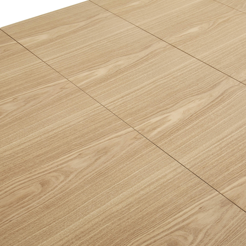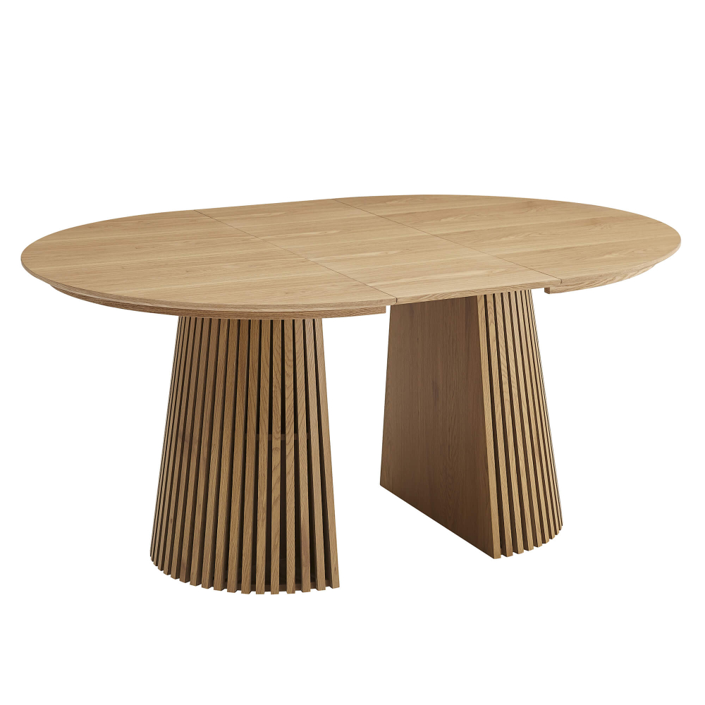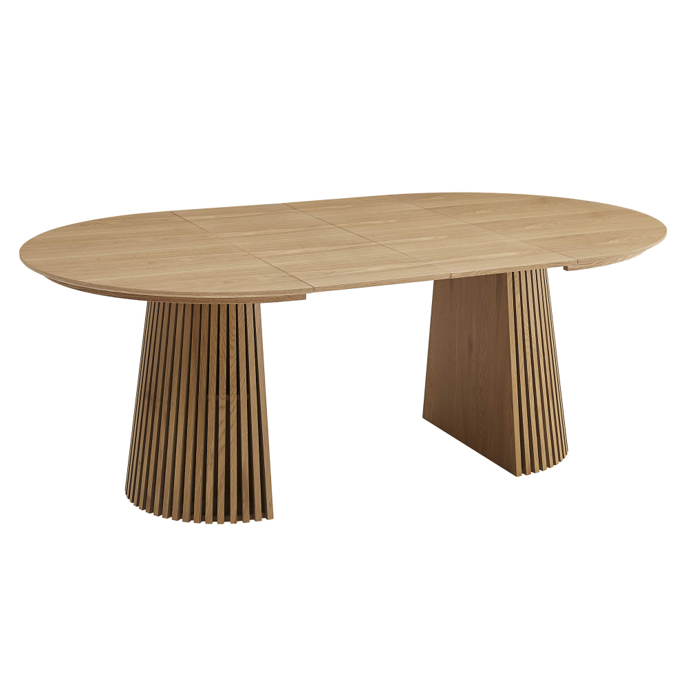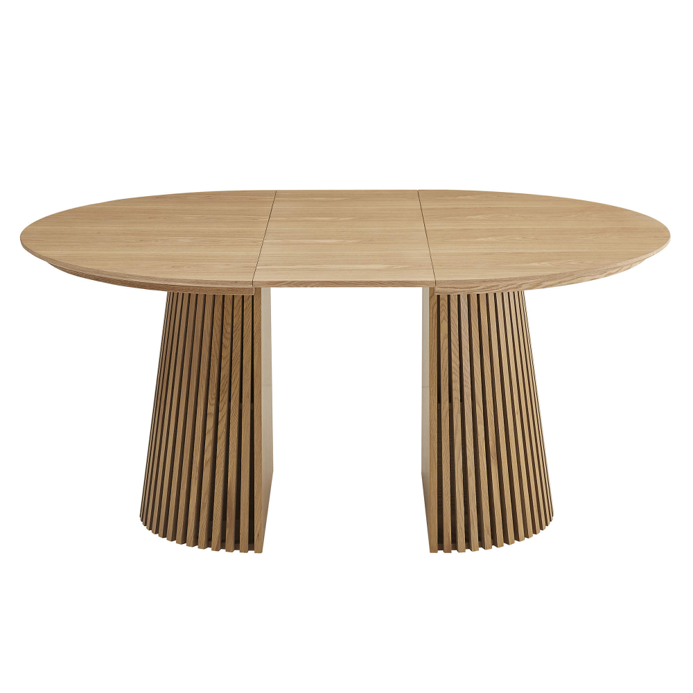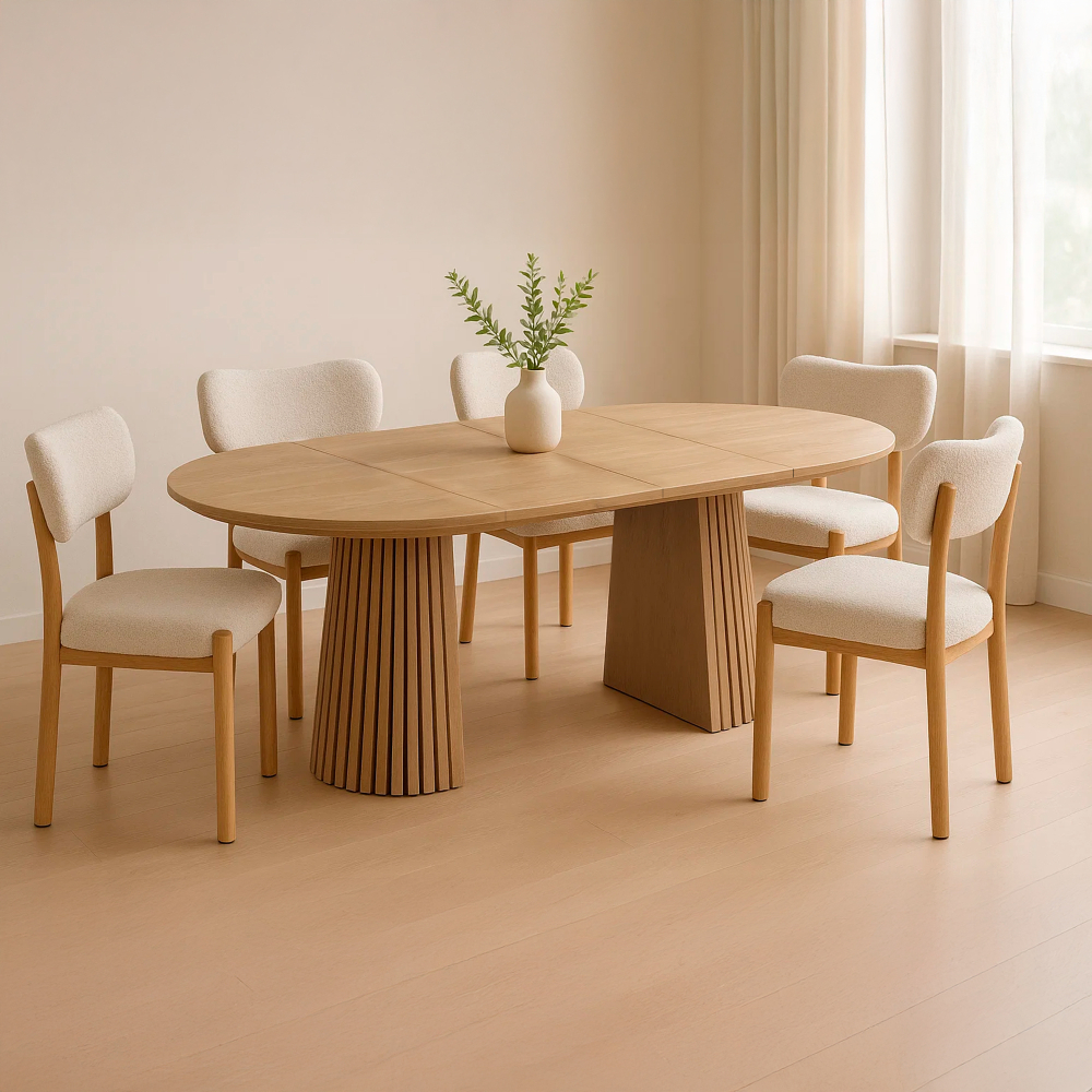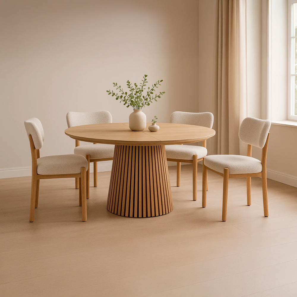 O grande destaque desta mesa de jantar é o seu design extensível, que vai dos 120 cm aos 200 cm através de duas extensões de 40 cm cada, mantendo sempre uma estética harmoniosa graças ao tampo em MDF revestido a folha de madeira. A sua base ripada confere-lhe um carácter arquitetónico marcante, transformando-a numa peça de impacto visual. A estrutura robusta, a textura quente da madeira e o formato redondo que evolui para oval tornam esta mesa de jantar extremamente funcional, elegante e adequada tanto para espaços modernos como escandinavos.