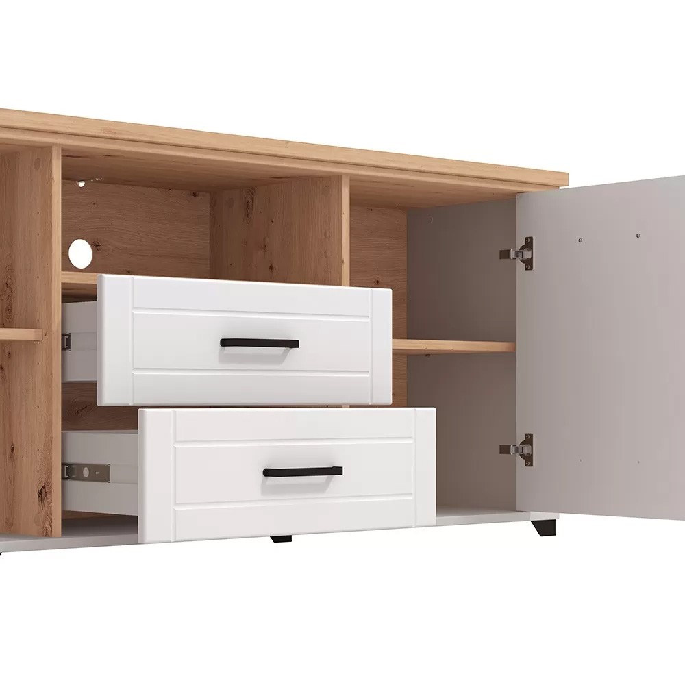 Este móvel TV destaca-se pelo equilíbrio entre funcionalidade e estética acolhedora. A combinação do acabamento mate com o interior em tom amadeirado cria um ambiente confortável e atual, ideal para salas de estar modernas. A altura do móvel facilita a organização e o acesso aos compartimentos, enquanto as gavetas permitem manter os objetos mais pequenos fora de vista, contribuindo para um espaço visualmente limpo.