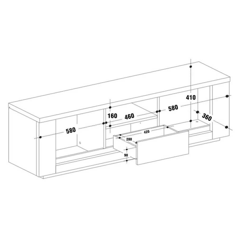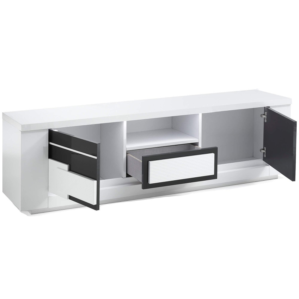 Este móvel TV alia organização eficiente a uma estética contemporânea forte. As portas com fecho suave elevam a experiência de utilização, enquanto a gaveta permite guardar acessórios de forma discreta. Os nichos facilitam o acesso a equipamentos multimédia e a iluminação LED cria um ambiente moderno, elegante e acolhedor, ideal para salas atuais.